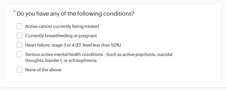 Problem is - now that I marked this with the exclusive choices - the disqualification page logic no longer works. It allows patients to go to the next question when the choose an option that should disqualify them.