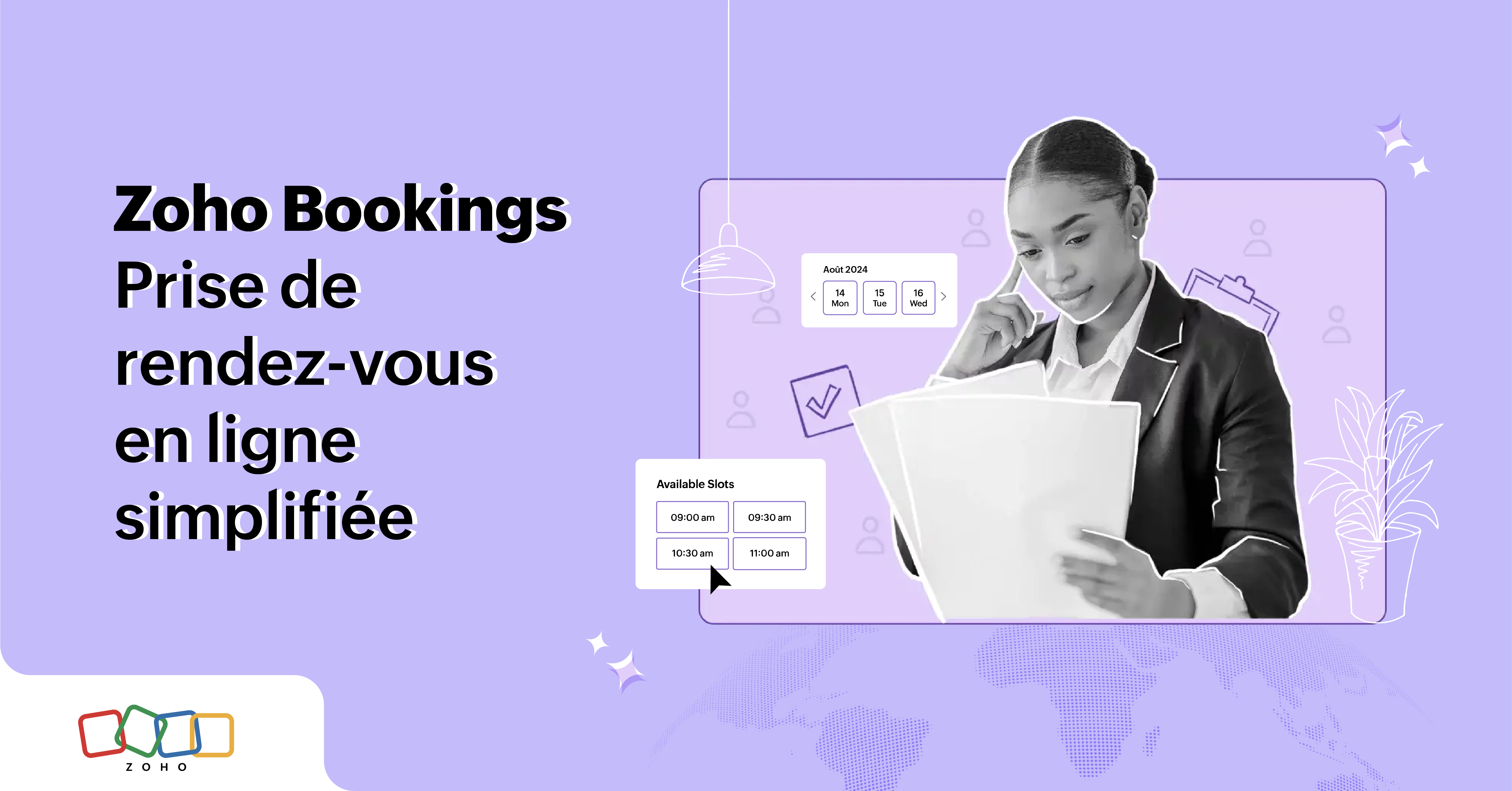 Zoho Bookings est un outil en ligne que vos clients peuvent utiliser pour prendre rendez-vous avec vous. Tout service, comme un salon de coiffure ou une boutique, exige que l'on s'accorde mutuellement sur le temps à passer avec le client. Il est donc primordial de planifier cette rencontre en fonction des disponibilités de vos clients (et des vôtres). Zoho Bookings s'occupe efficacement de cette partie . Les clients pourront accéder à cette information en ligne à tout moment, choisir le service désiré, la date et l'heure de leur choix et prendre rendez-vous facilement.