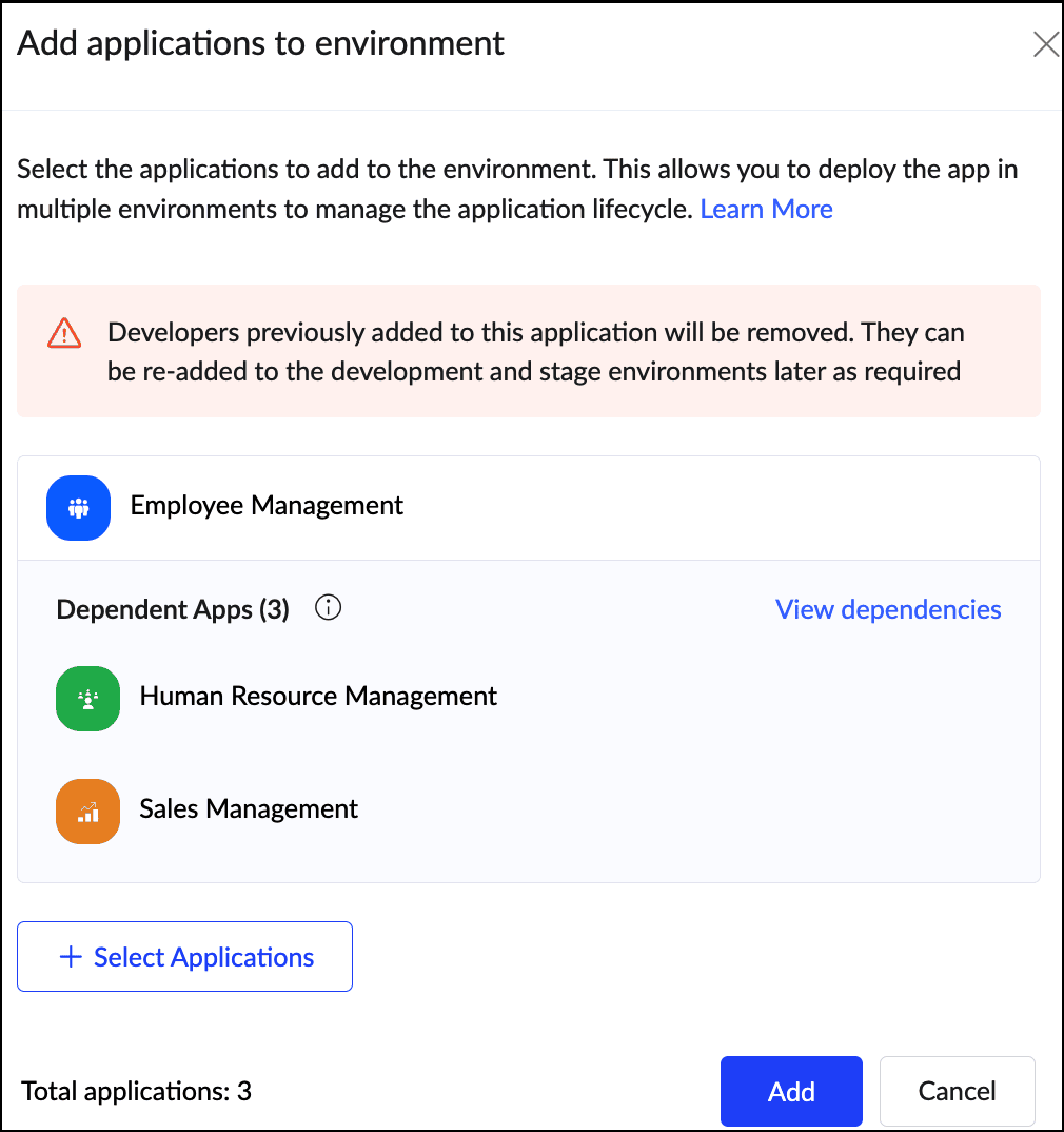 Assume a company uses separate Creator apps for different functions, like employee management and payroll processing. Since the payroll depends on the employee data, one app references another in a linear manner. With this new update, you can add both apps together to environments. This ensures seamless ADLM flow without breaking app relationships.