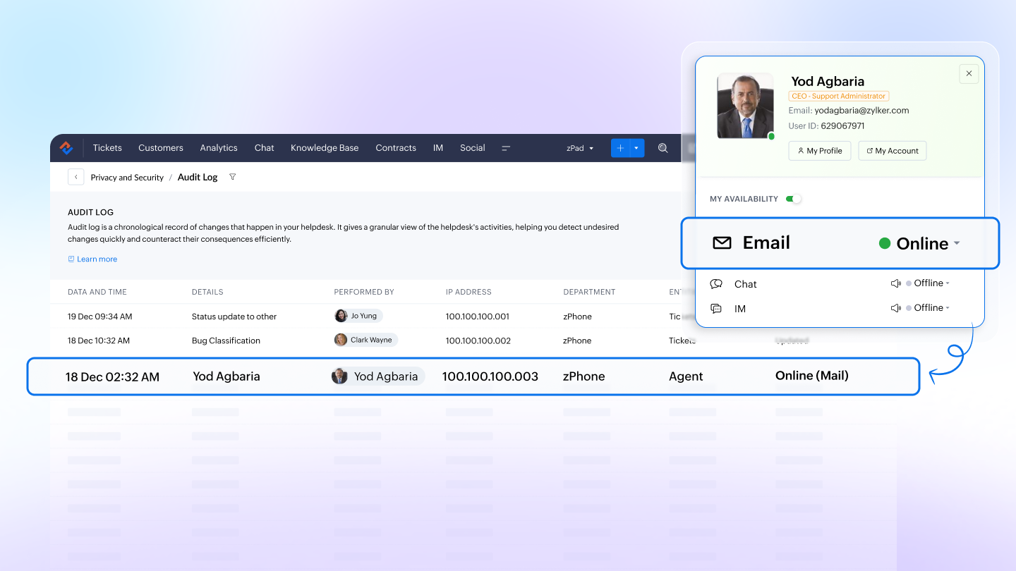 2. See each agent's availability status (online or offline) across channels like email, phone, chat, and IM for greater visibility into agent availability.