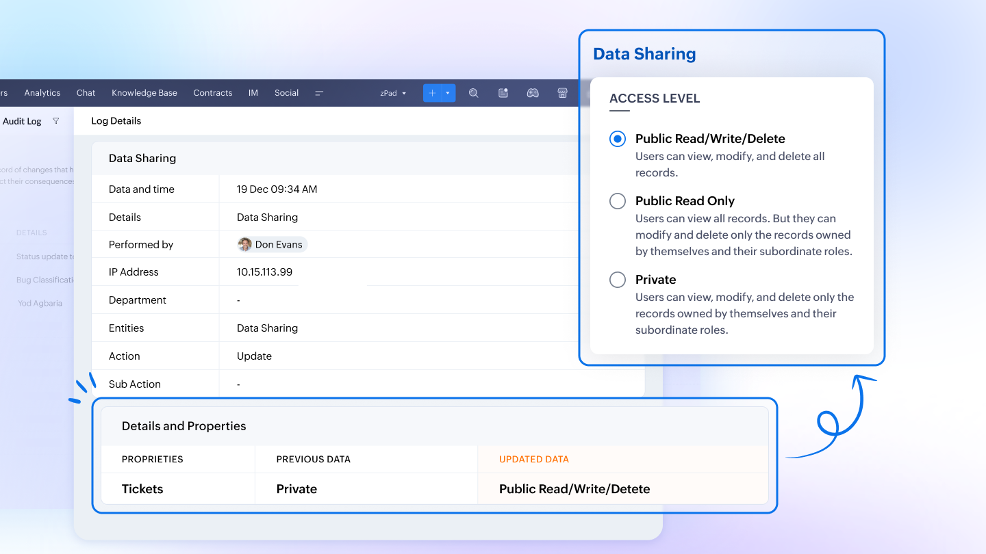 Changes made in the Contacts, Accounts, and custom module records can be viewed in detail page under the History tab. The date and time, agent name, IP address, and the action performed are displayed to ensure transparency.
