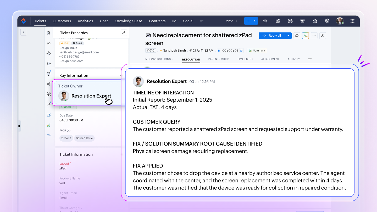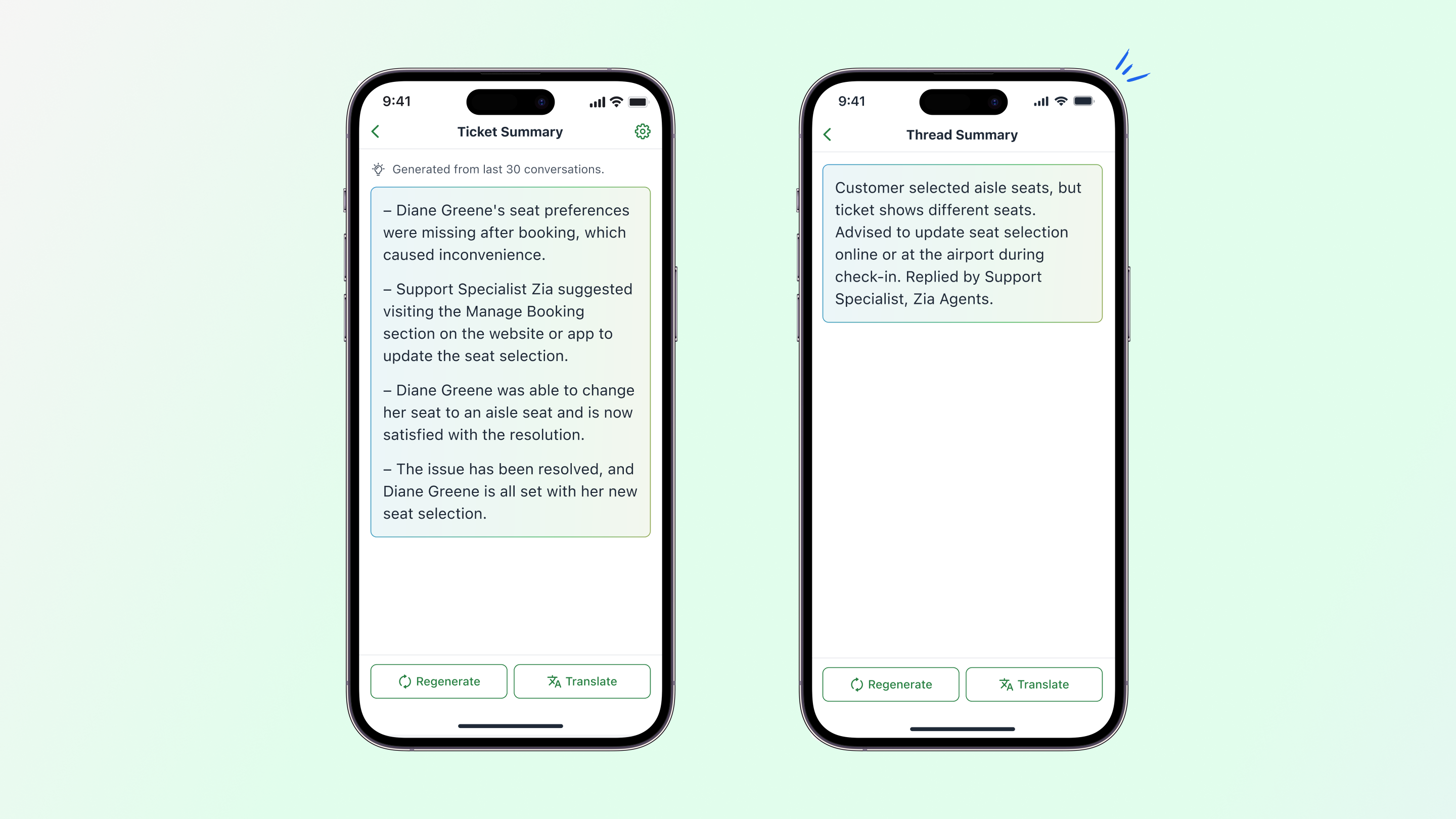 Zia simplifies the ticket and thread content and provides a concise overview in a simple, easy-to-understand summary to help agents comprehend the issues quickly. This text can also be regenerated and translated into multiple languages supported by Zia.