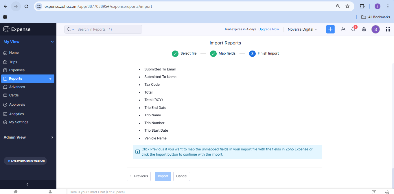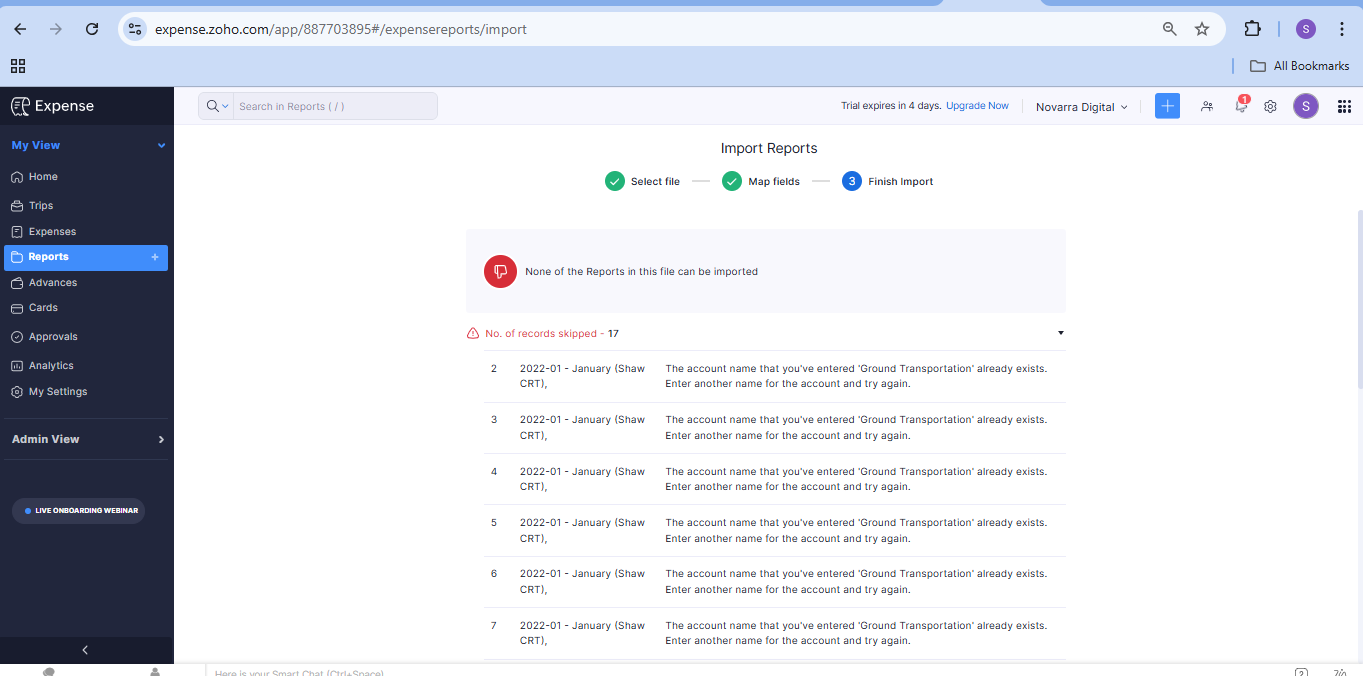 Im trying to import reports from another Zoho expense account to mine and im getting errors that won't allow the import to happen