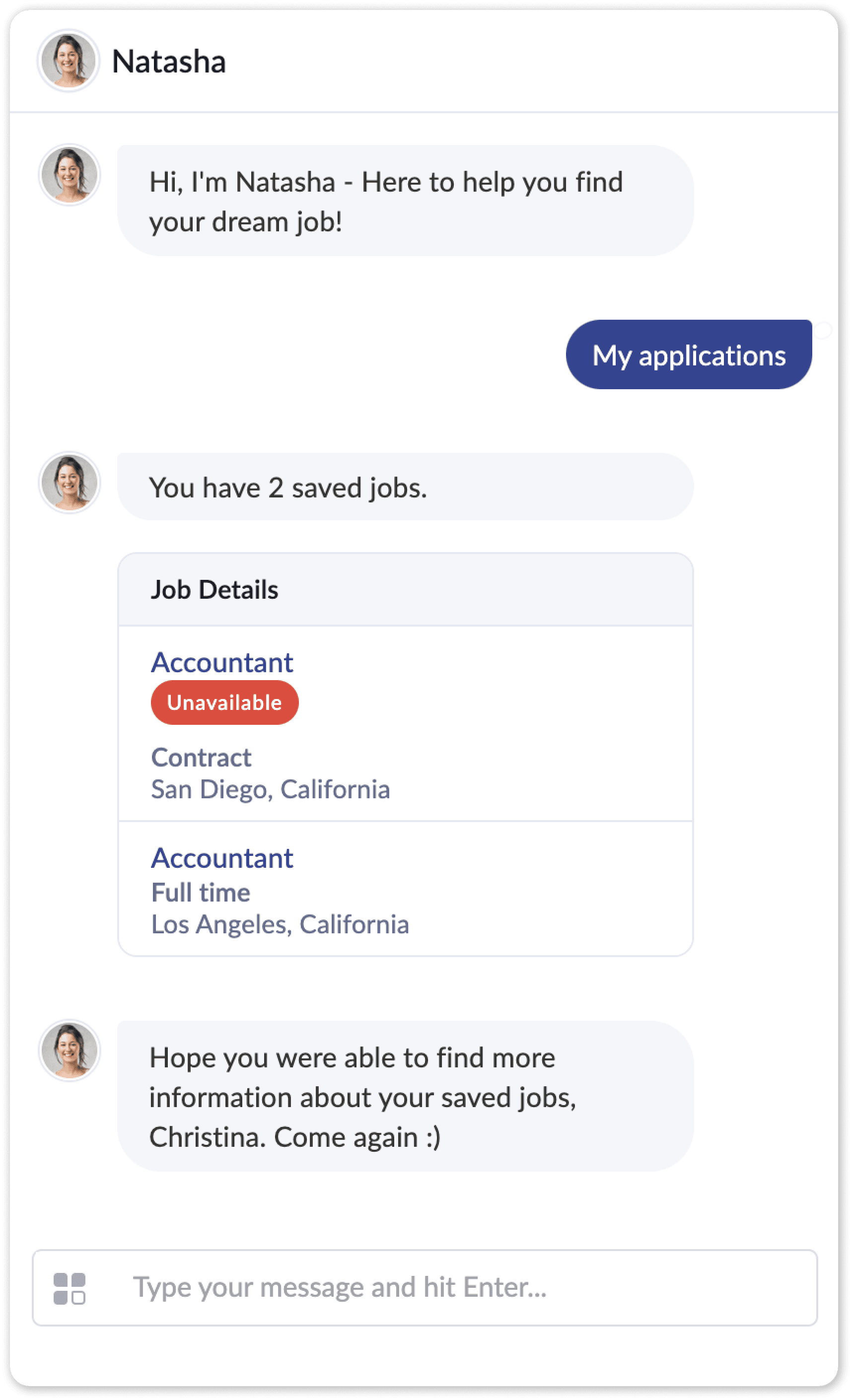 - When displaying matching jobs, Zia only shows the job title, location, and type for each opportunity.