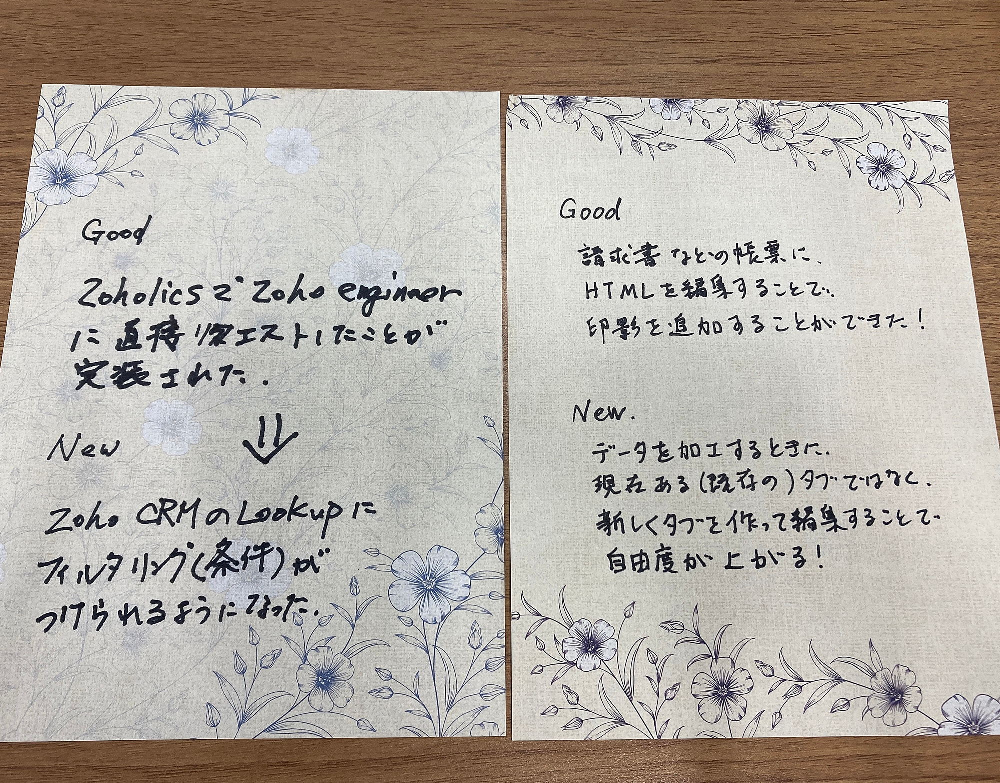 直近1カ月間で、参加ユーザーさんの普段利用しているZoho サービスについてよかったこと(Good)、新しい発見(New)を共有し合うグループワークを実施しました。