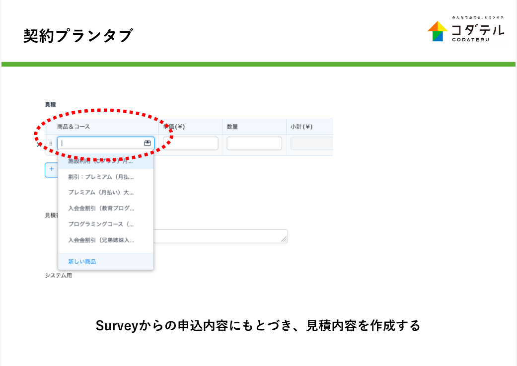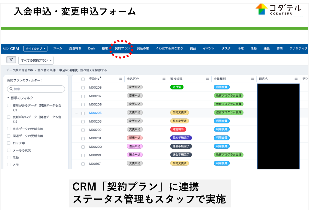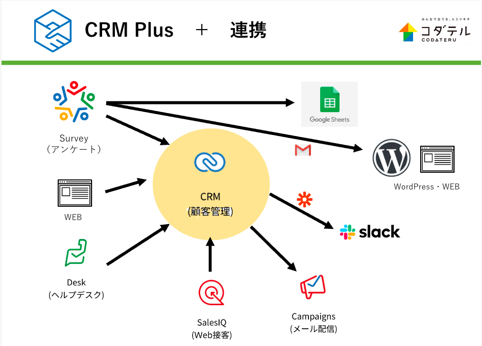 Zoho CRM との連携:問い合わせフォームに入ってきた情報を見込み顧客に。CRM 上の契約プランに連携し、ステータス管理を自動的に反映。