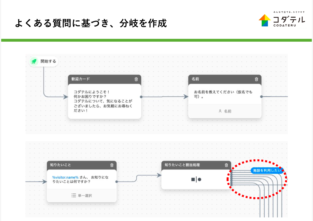 自社Webページにチャットボットを設置し、回答内容に応じた分岐を作成。