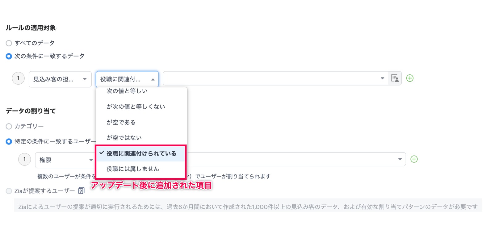 今回のアップデートにより、ユーザーの役職に基づいてデータを割り当てられる新しい選択肢が追加されました。