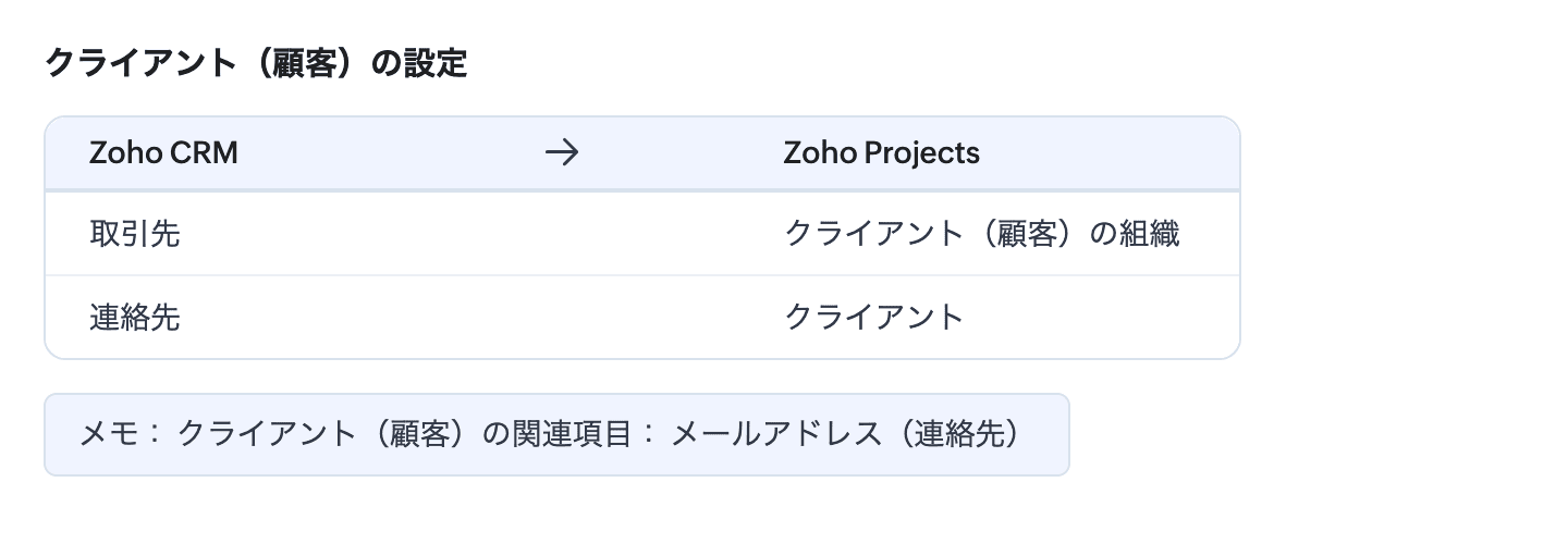 現在は、設定画面上部に分かりやすく表示され、Projects のクライアントがCRM の連絡先や取引先にどのように関連付けられているかを、ユーザーが確実に把握できるようになっています。