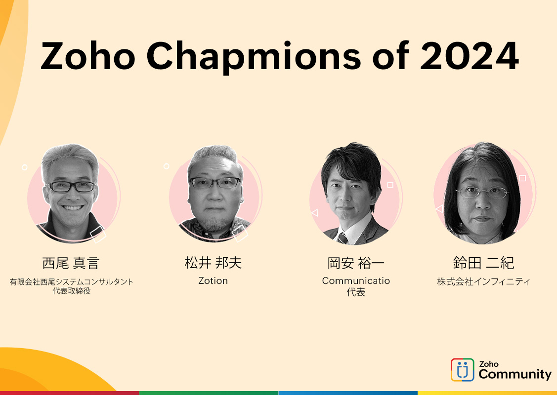 Zoho コミュニティでは、2024年の1年間でコミュニティに貢献し、他ユーザーの役に立つ活動・情報発信を特に積極的に行ってくださった4名の方を、 「Zoho Champion」 として表彰させていただきます!