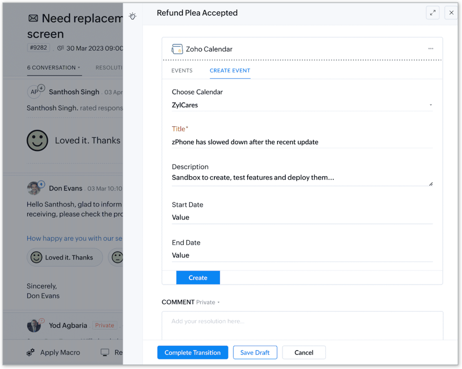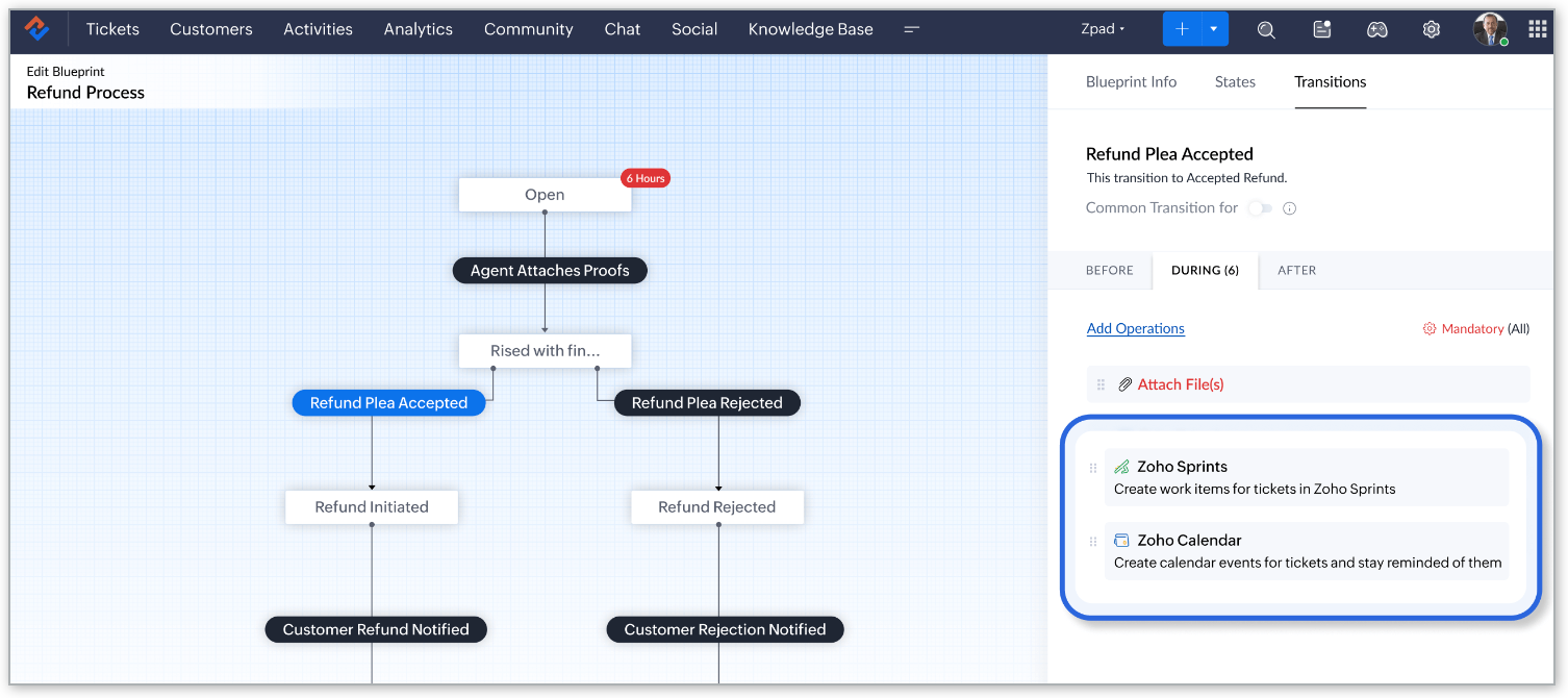 For instance, if a customer support team aims to enhance scheduling during a blueprint transition, they can effortlessly integrate the Zoho Calendar extension. This addition empowers support agents to efficiently schedule follow-up calls and manage appointments as part of the blueprint transition.