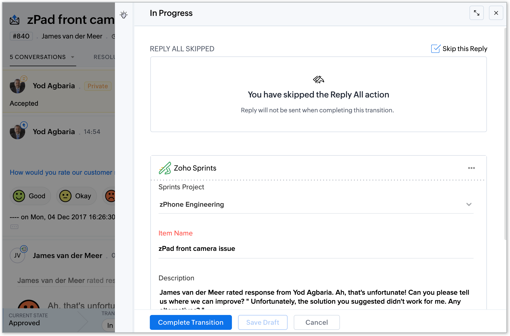Likewise, admins can utilize the Zoho Sprints extension within the blueprint transition, ensuring a seamless workflow for incorporating tickets as work items and managing tasks or bugs linked to customer interactions during the blueprint transition. This functionality empowers support agents to effortlessly include customer-reported bugs or new feature requests into the backlog of the relevant project.
