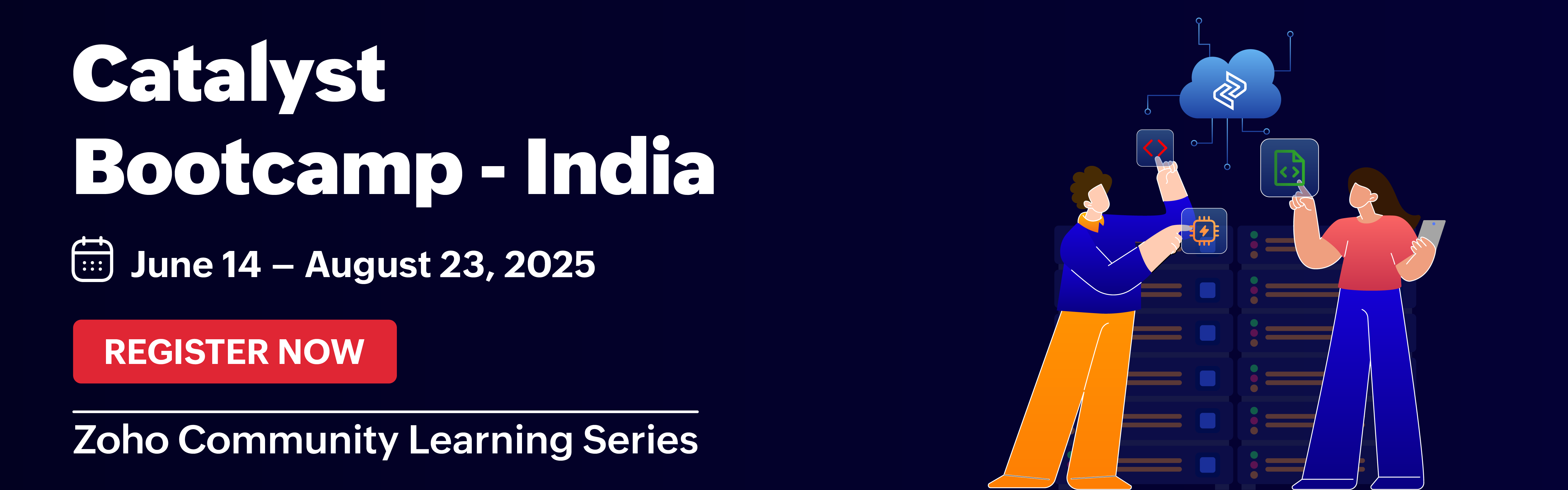 Following the success of the first set of bootcamps on SalesIQ Zobot and Extensions last year, we're ready for the next set of bootcamps—this one dedicated to Catalyst by Zoho! These bootcamps are aimed to empower developers to build, scale, and deploy applications with speed and precision, using Catalyst.