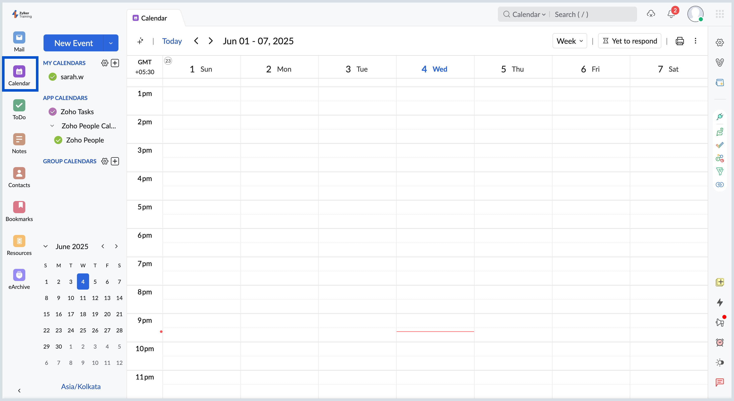 Calendar in Zoho Mail is conveniently located in the left pane, along with your other productivity apps. You can create a new event in the Calendar by clicking the New Event button or simply selecting a time slot on the calendar grid.