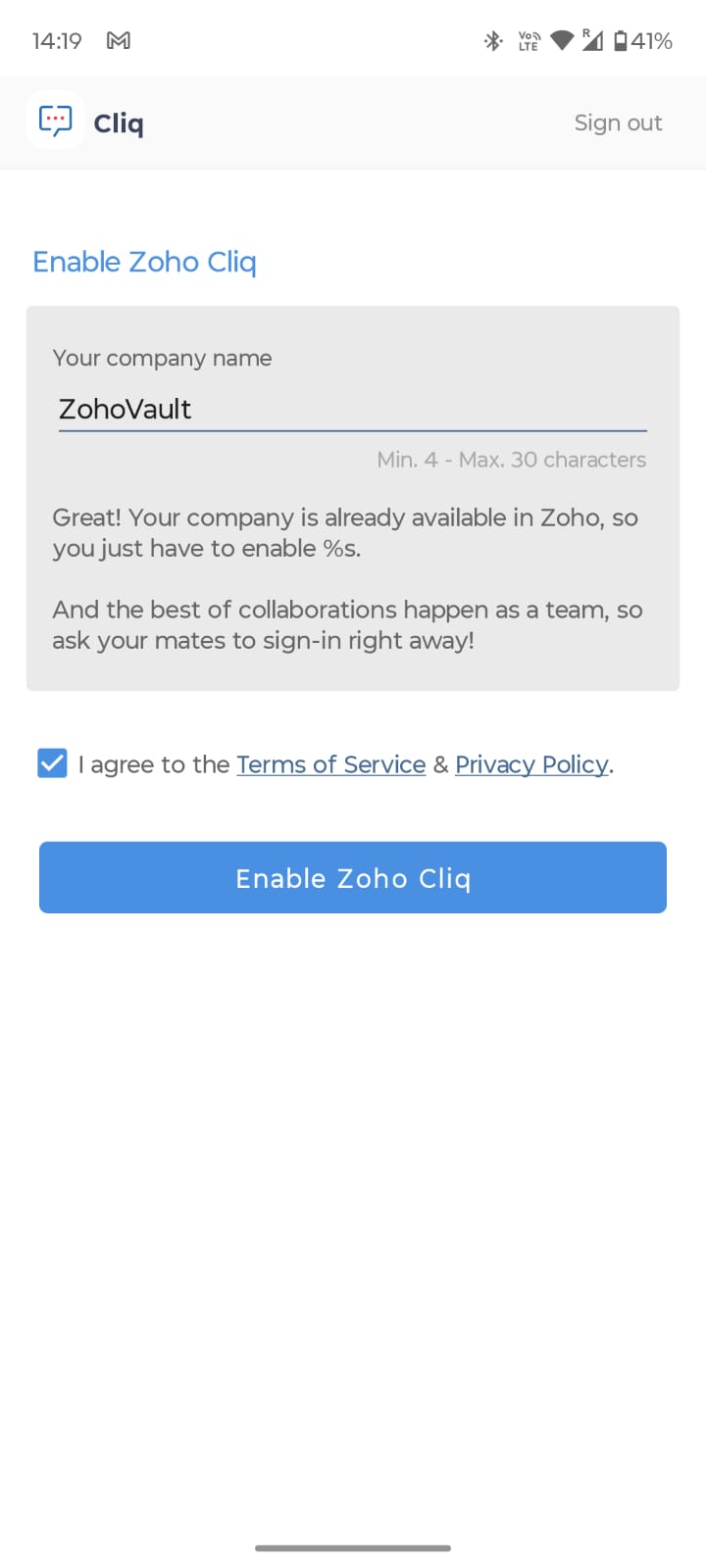 • Screen with: Company Name, ZohoVault, Terms of Service checkbox, “Enable Zoho Cliq” button