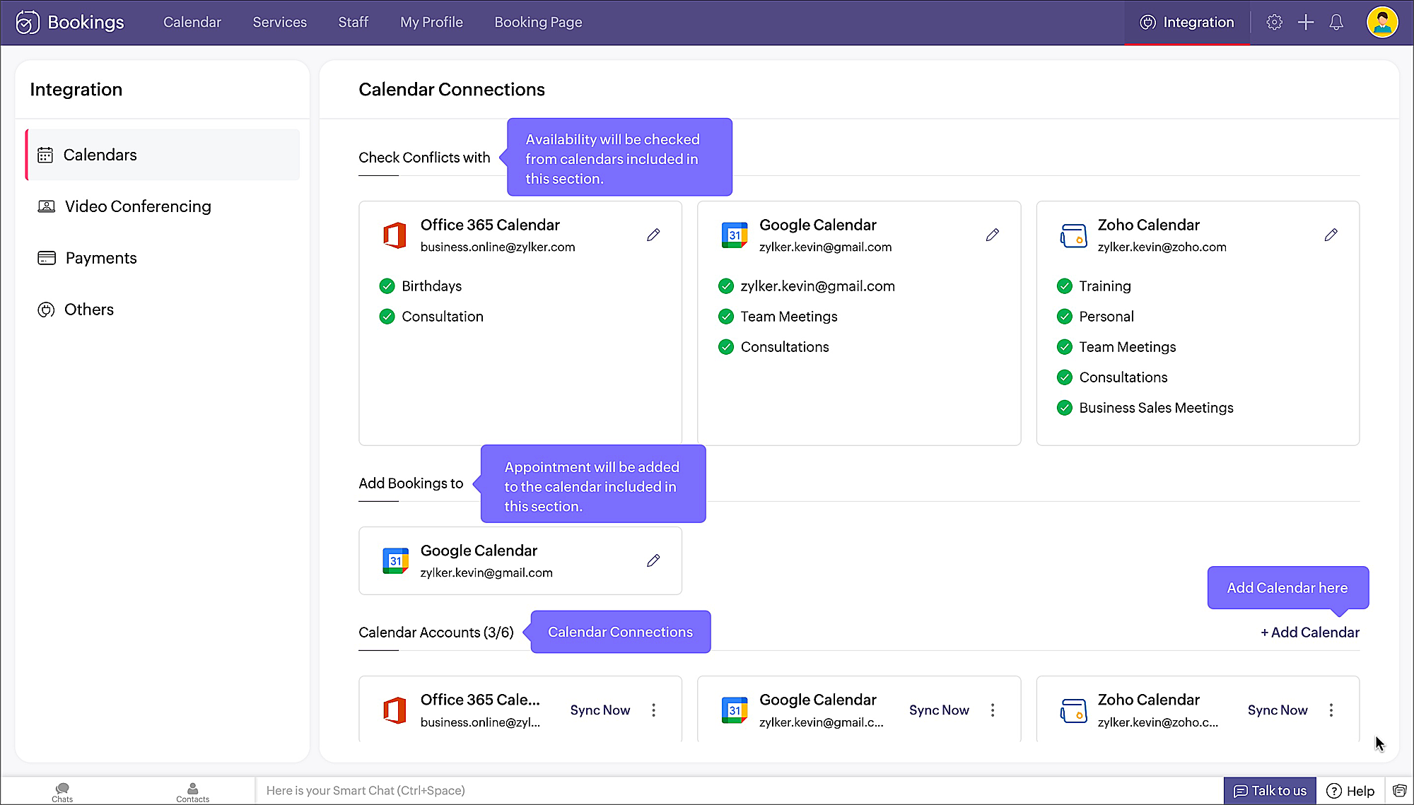 With the forthcoming update, admins do not need to add or manage staff calendars. Staff will have a Calendar Connections section on the menu bar, through which they can add and manage their own calendars. However, admins can still view staff calendars under the Staff menu option.