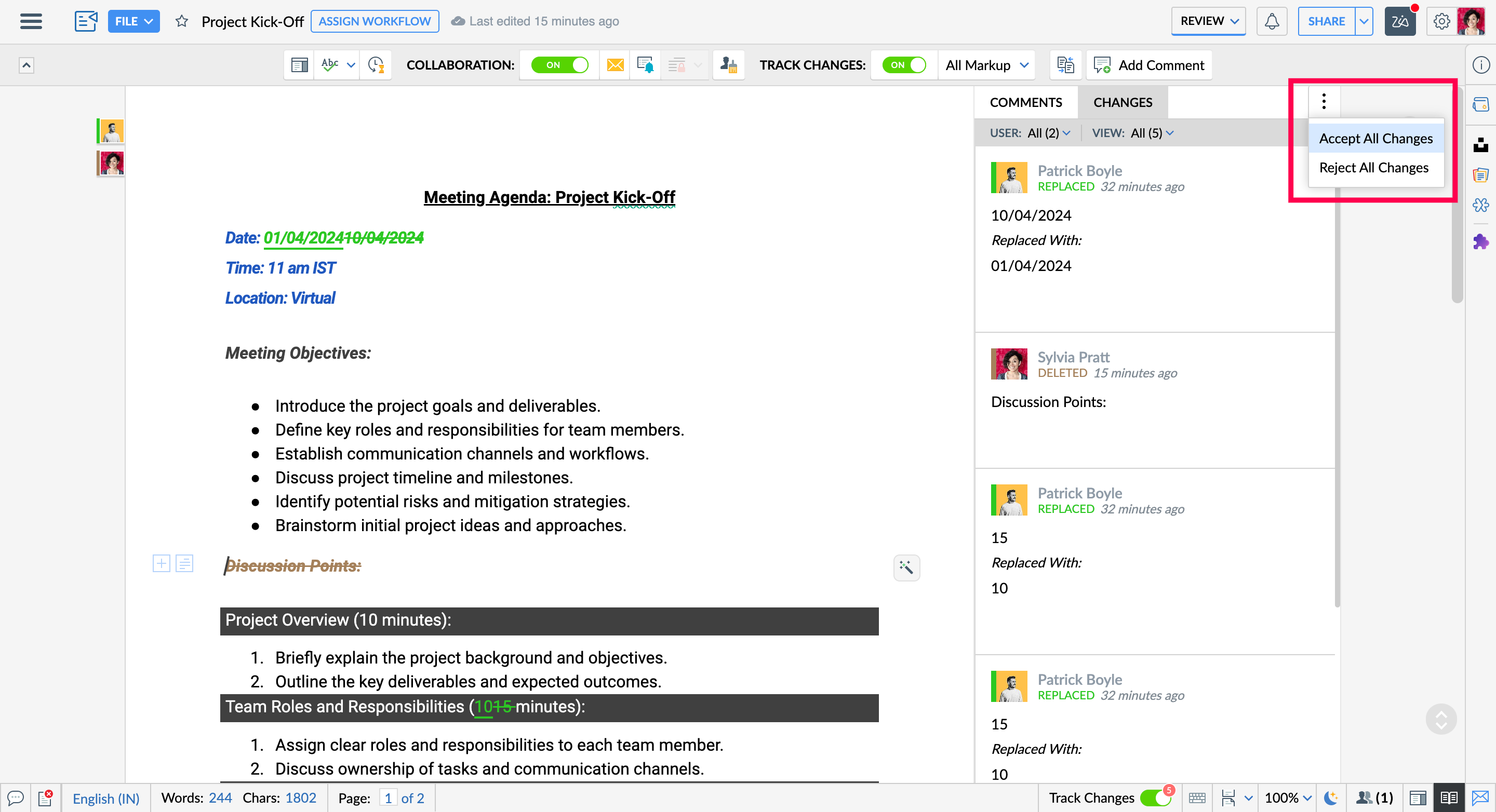 - You can accept or reject changes individually or all at once, making the review process faster and more efficient.