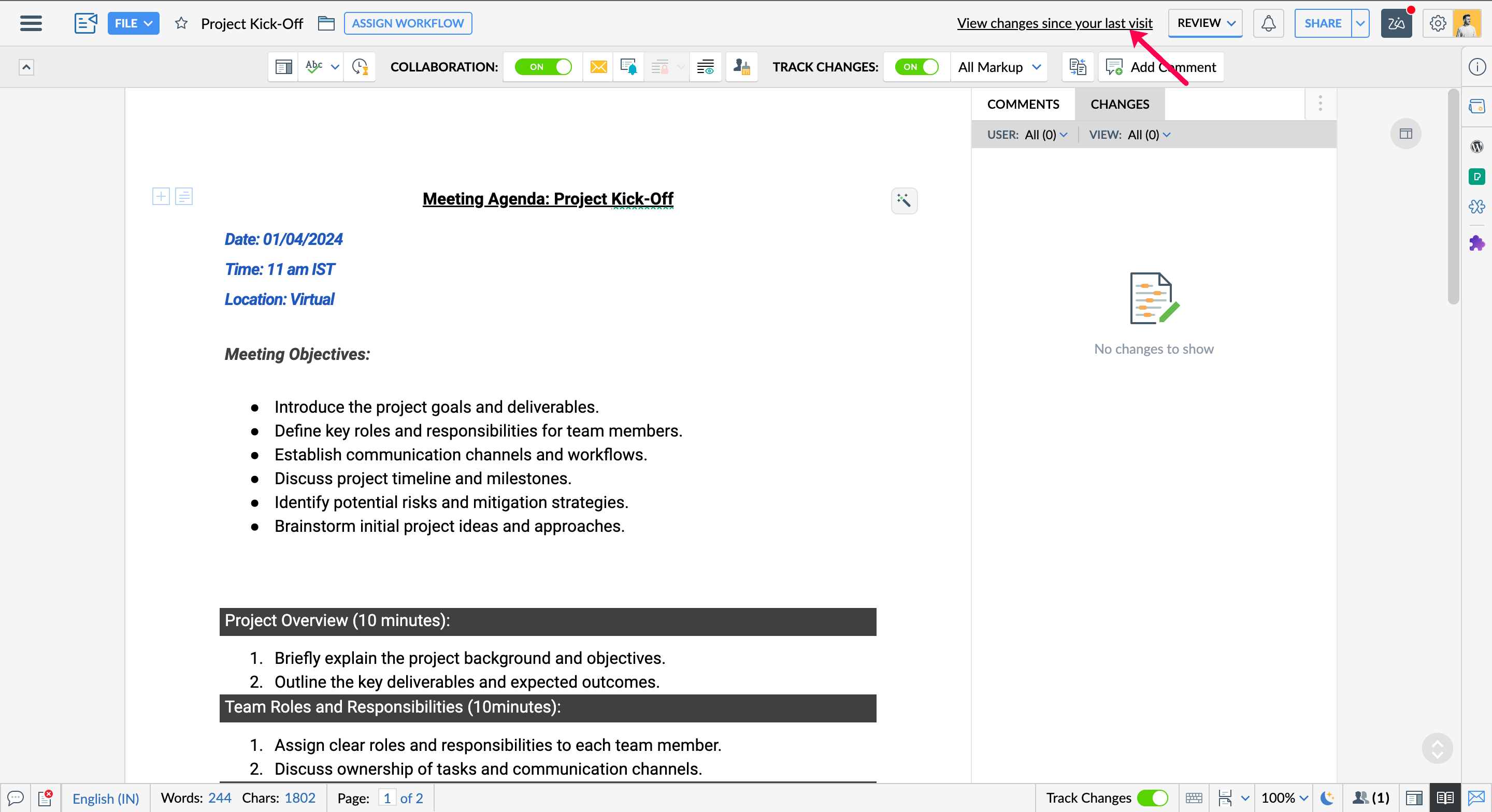 - Collaborators with Edit and Share access can instantly see all edits made since their last visit by clicking "View changes since last visit."