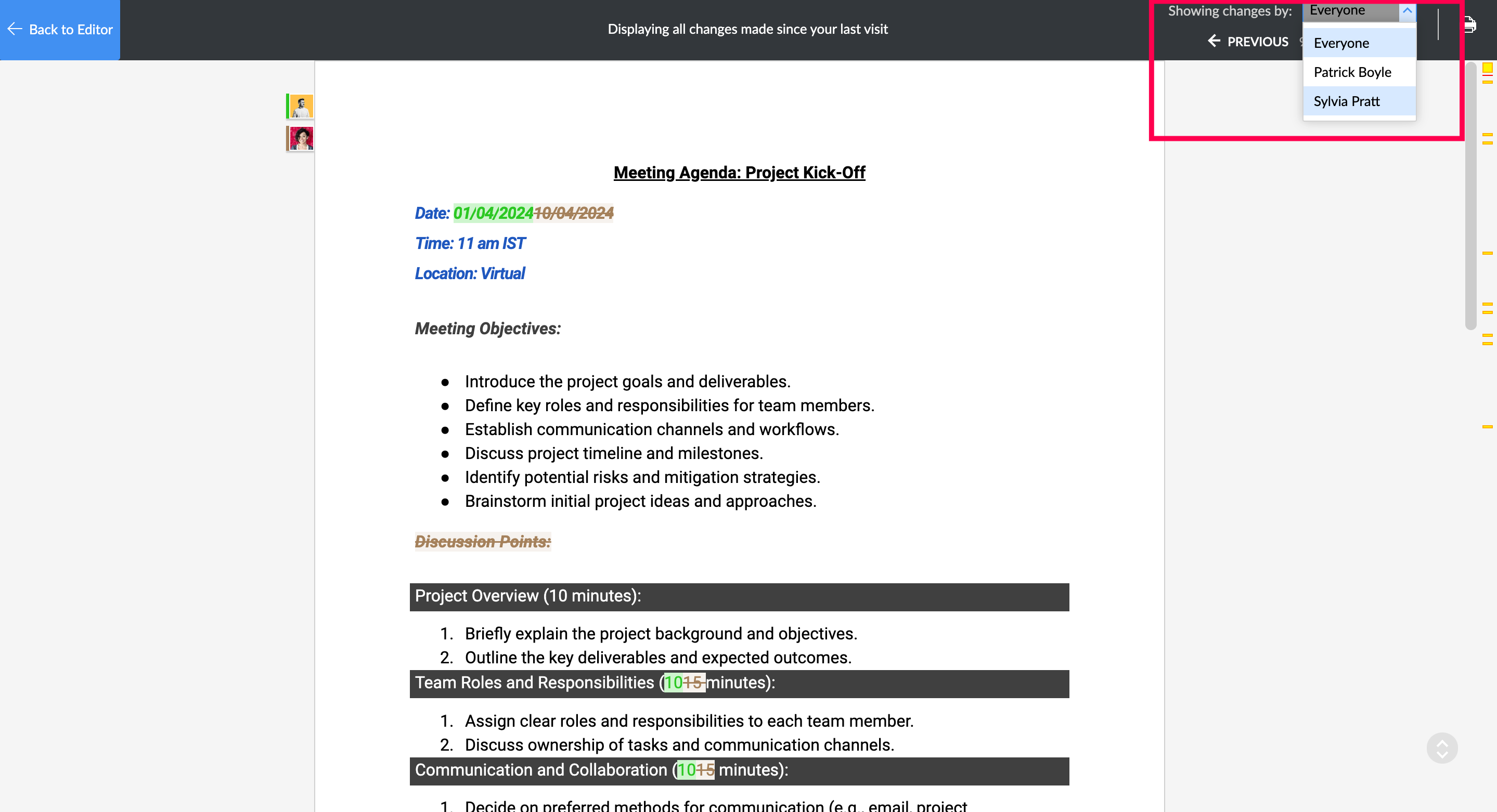 - Everyone involved in a document can see exactly what changes have been made, when, and by whom. This ensures everyone is on the same page and avoids confusion.