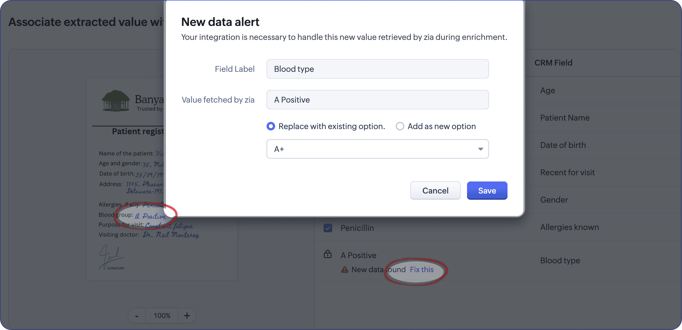 Scenario: The front-office executive of Banyan Hospital uses ICR to transfer form-based, handwritten patient information into their CRM system.
