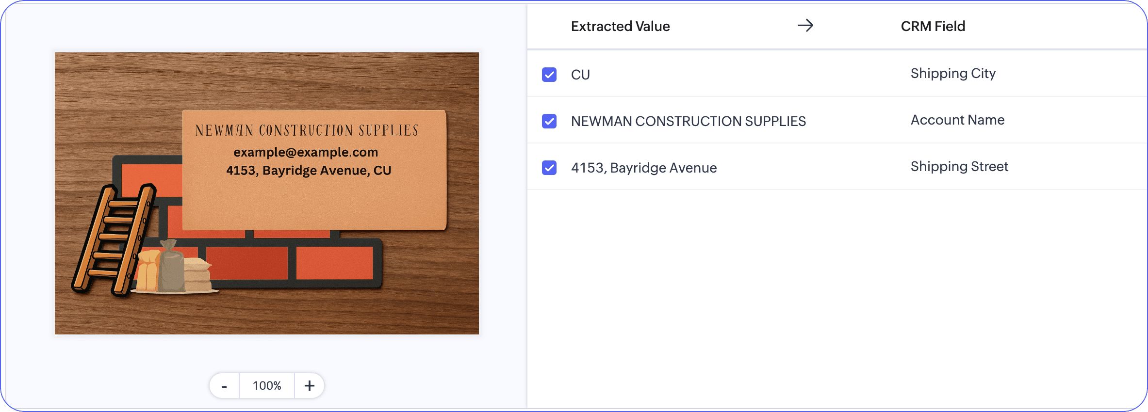 By training Zia with sample images, you could create and enrich CRM records with data extracted from standard printed text.