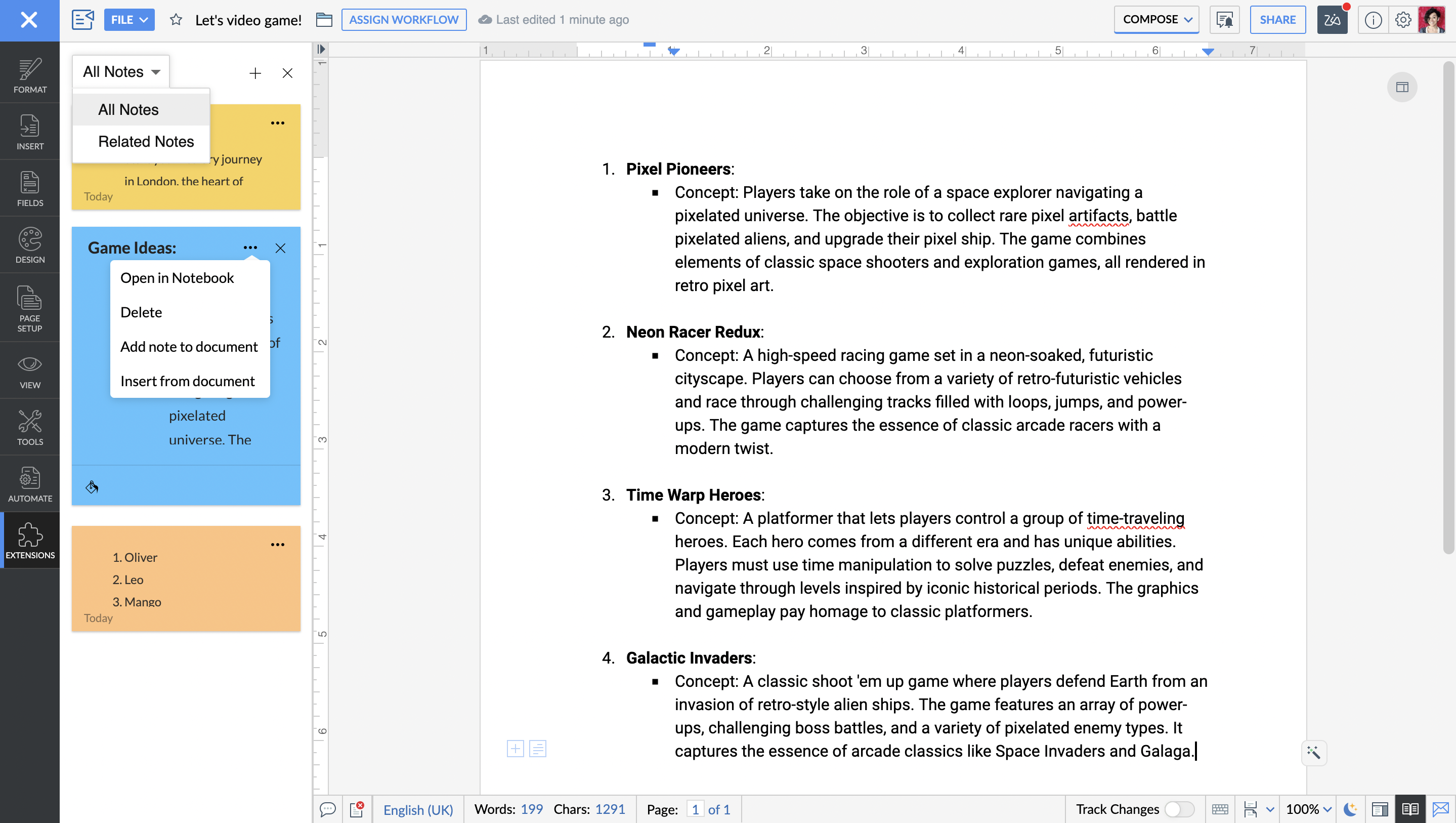 - Associate notes with a document: Link specific notes with your working document in a single click so they're available for easy reference.