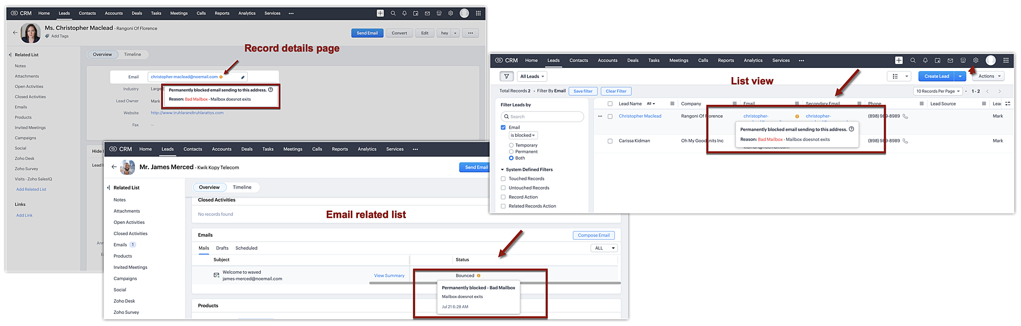 As part of this enhancement, users with Send mail permissions can directly unblock email addresses that are temporarily blocked from within Zoho CRM.