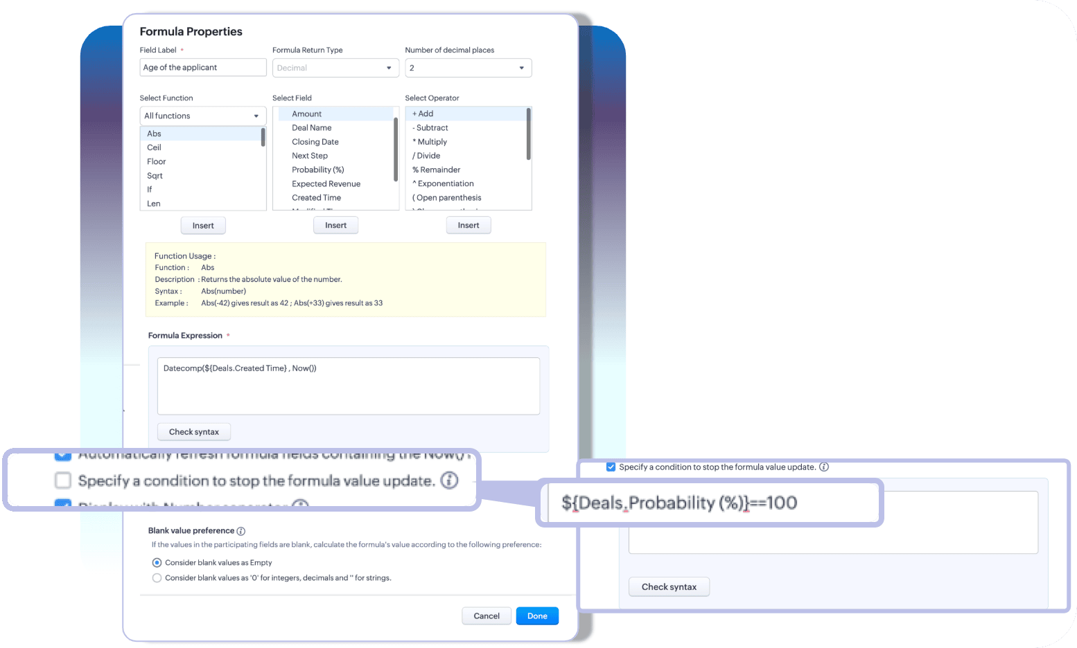 Previously, there hasn't been any functionality in Zoho CRM that effectively stops a formula from computing. Even when a cutoff date has passed, formulas continued to compute durations. With this enhancement, you can stop computations or freeze values based on specific criteria.