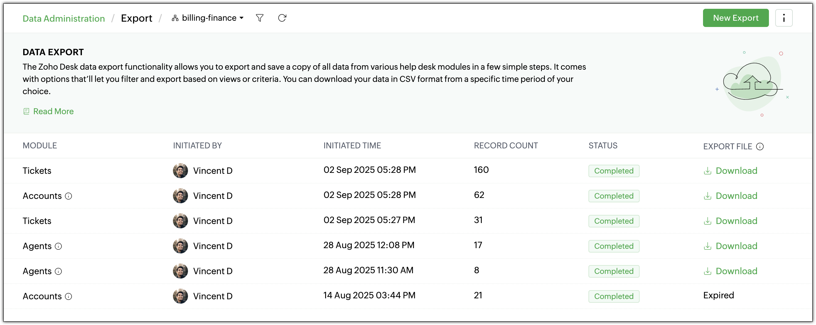 The export record limit has been increased from 3,000 to 50,000 records per export. Need to export more records at a time? Use Zoho Desk’s Data Backup to retrieve the complete dataset. - Redesigned export history page