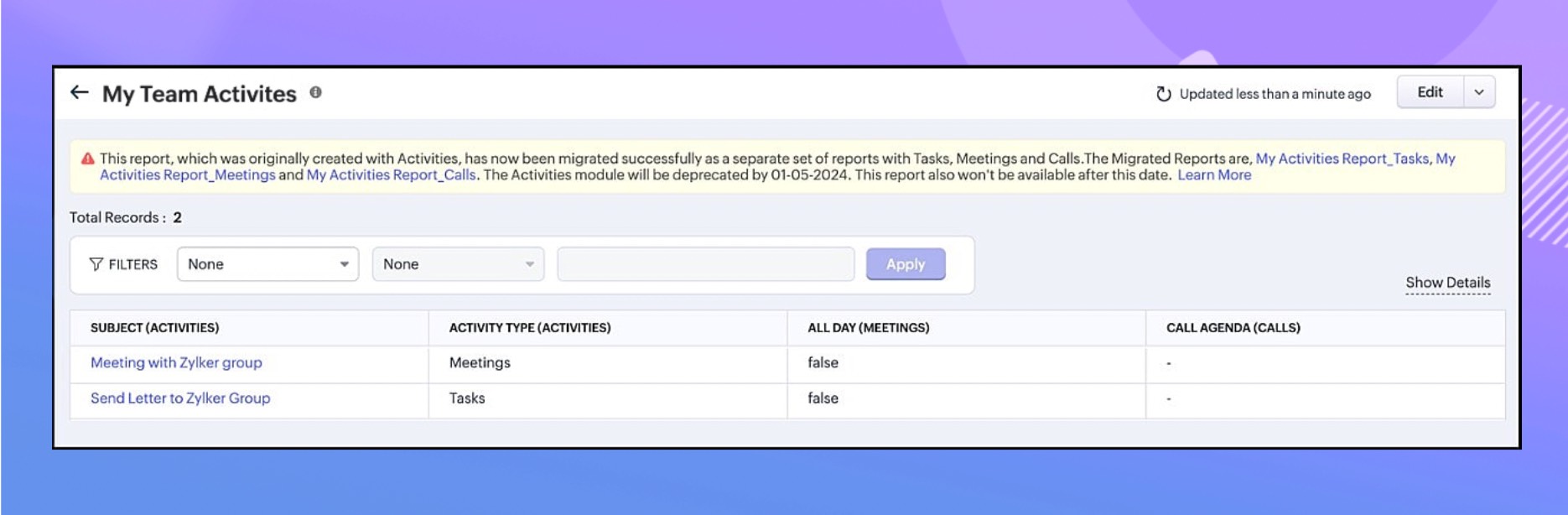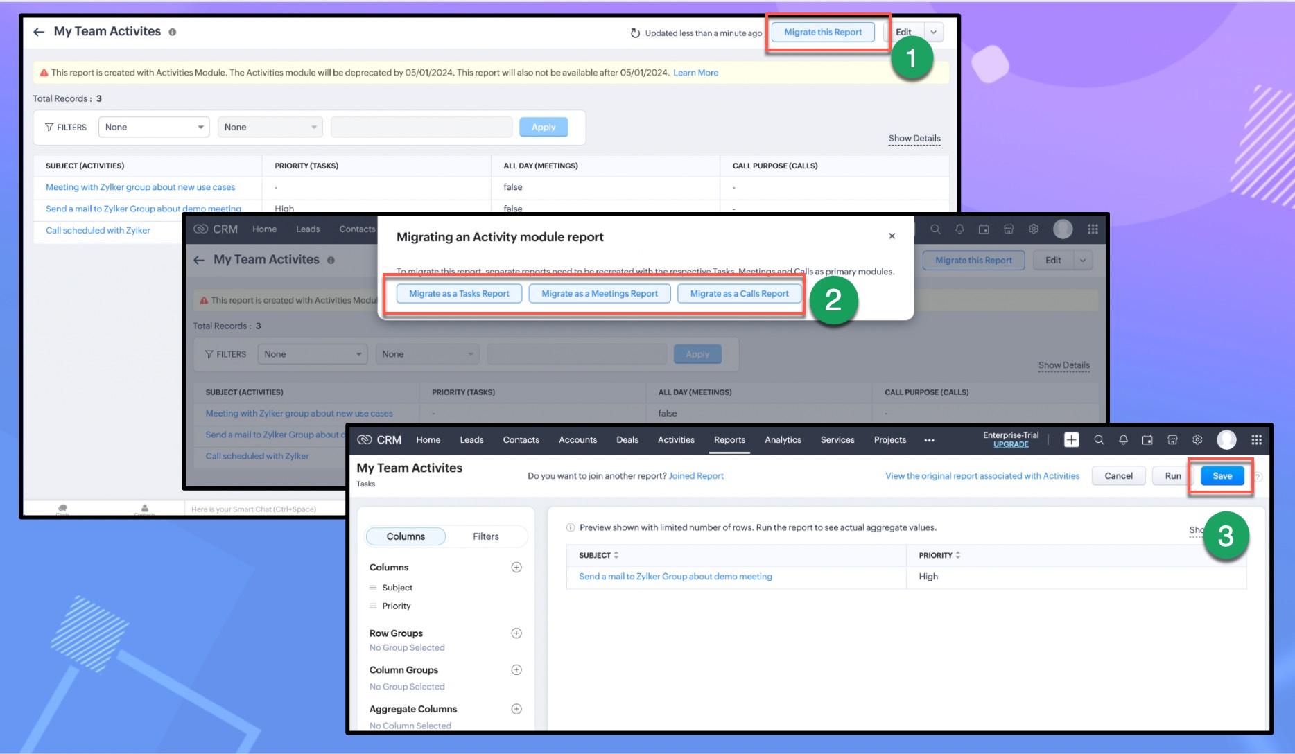Similar to migrating dashboard components, you can also migrate reports associated with the Activities module to the relevant Tasks, Calls, and Meetings modules based on the report's criteria.