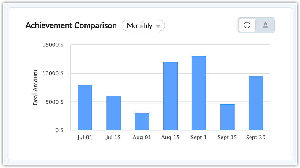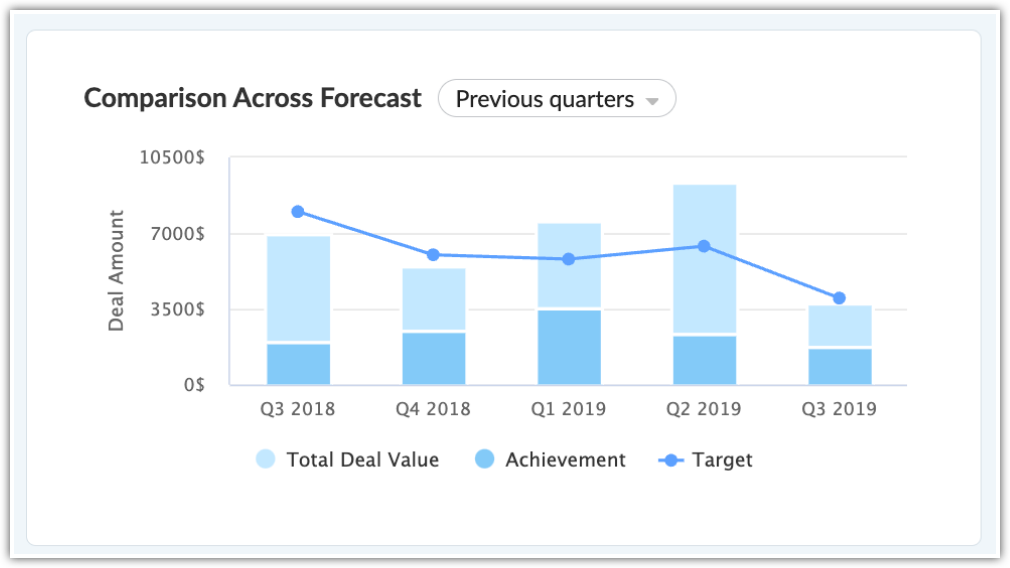 - Comparison Across Forecasts: This chart helps users compare their targets, open deals, and achievements across different forecast periods. The bars signify the total deal value assigned to a particular user and contrast it with the deal value closed at the end of the period. Combined with the line plot representing targets in the selected time frame, this enables users to determine whether the target is achievable, and how much more effort is required.