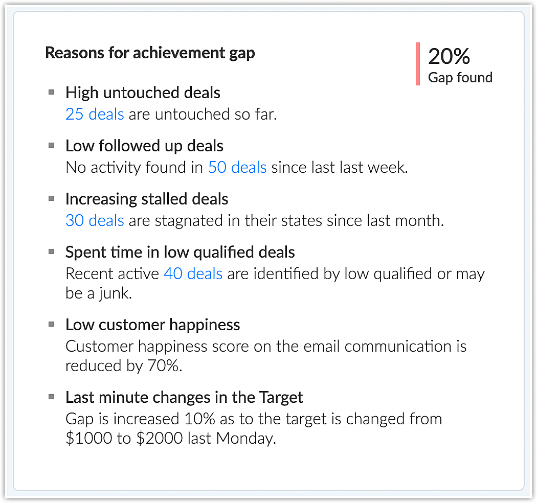 We didn't stop just at providing insight into user performance; we've also introduced two additional sections: reasons for gap, which highlights the gap between the target and the achievement and provides reasons that could have led to the gap, and the improvements section, which lists out the various improvements the user can make in order to reduce the gap.