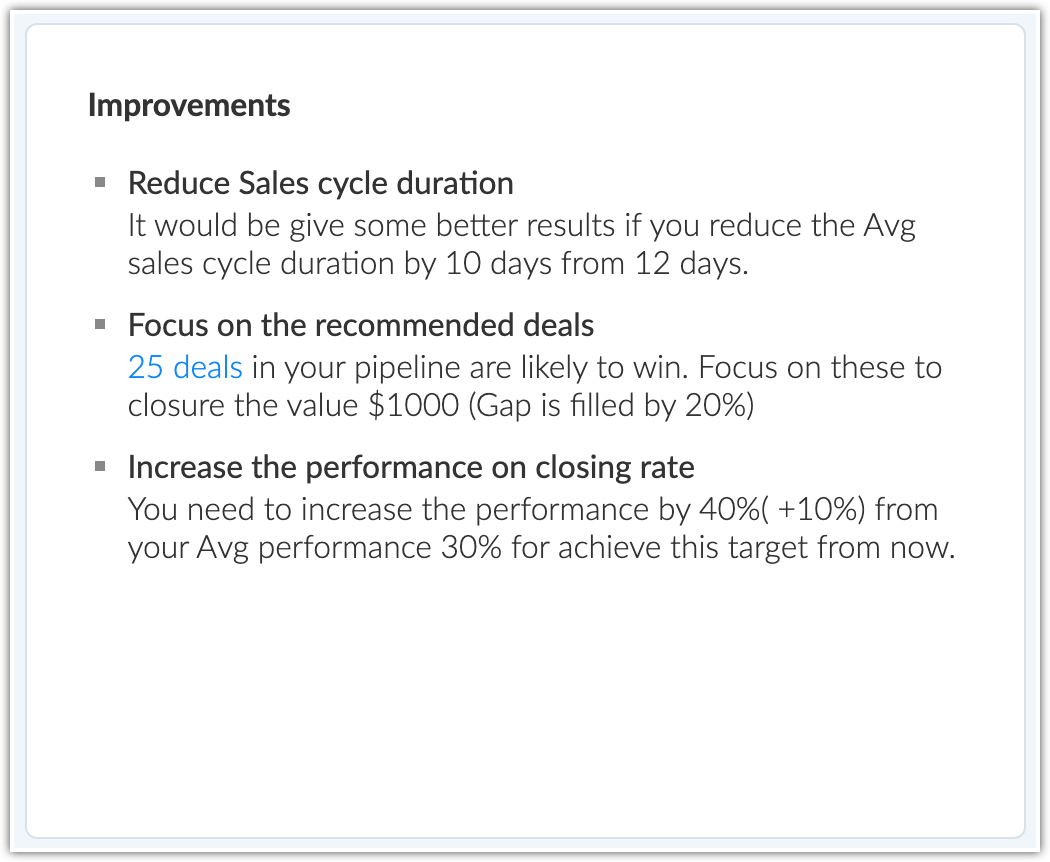 - Improve closing rate: This improvement is suggested if the user needs to improve their closing rate, along with the percentage by which it needs to increase.
