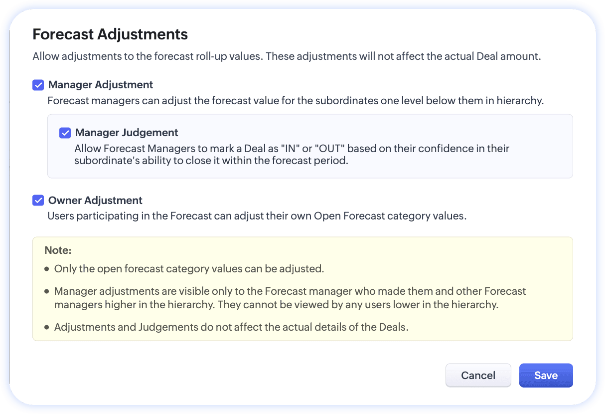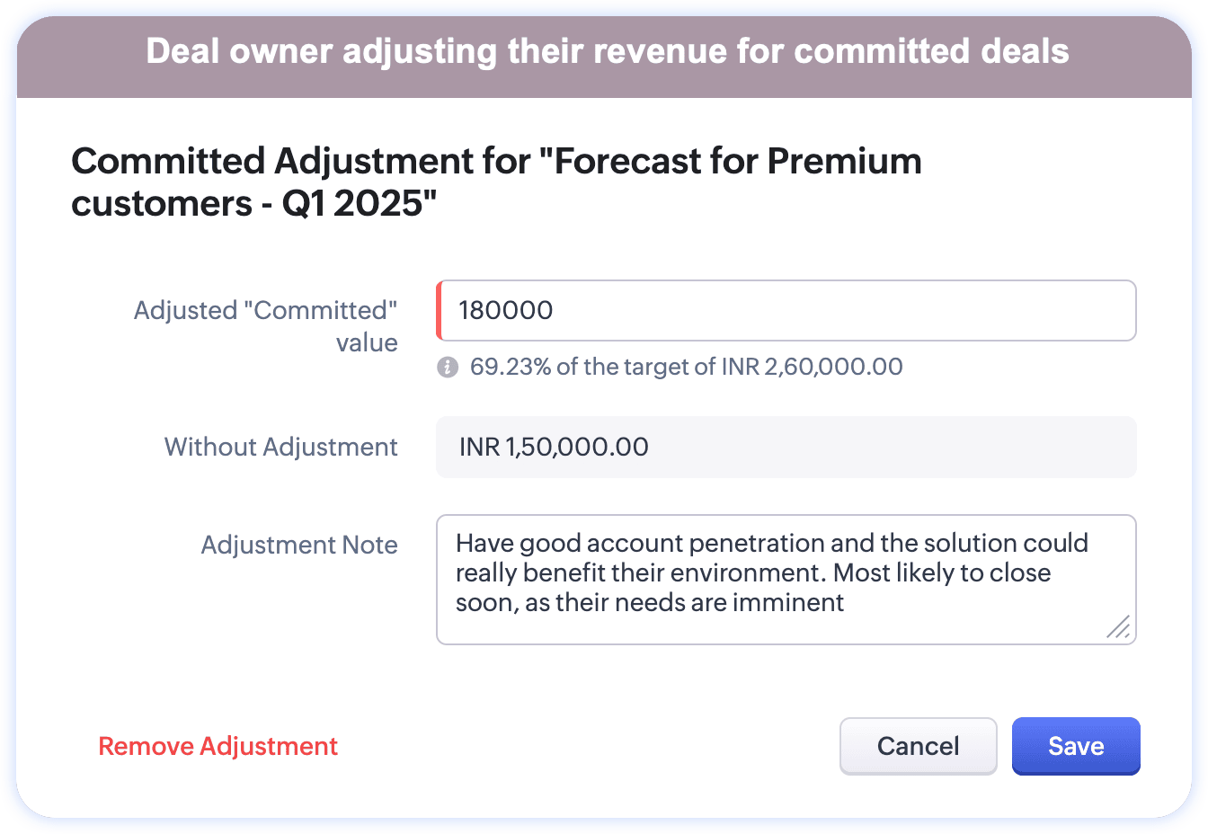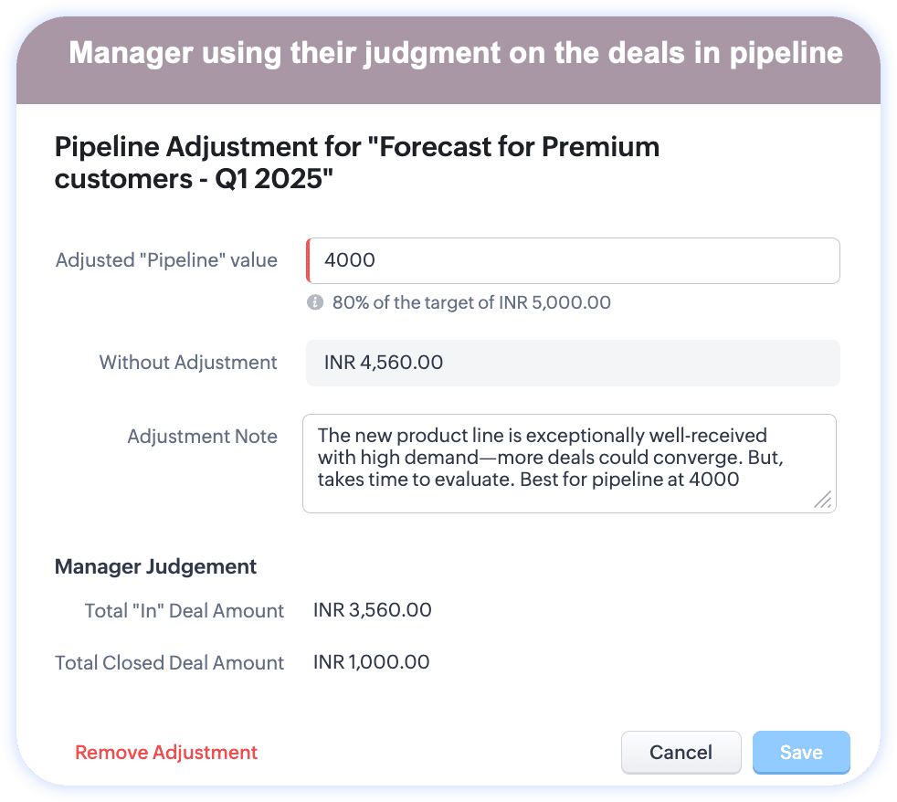 Manager adjustment lets managers adjust and/or reevaluate the revenue per their expertise and their assessment on their subordinates' (deal owners') efficiency and strategic skills.