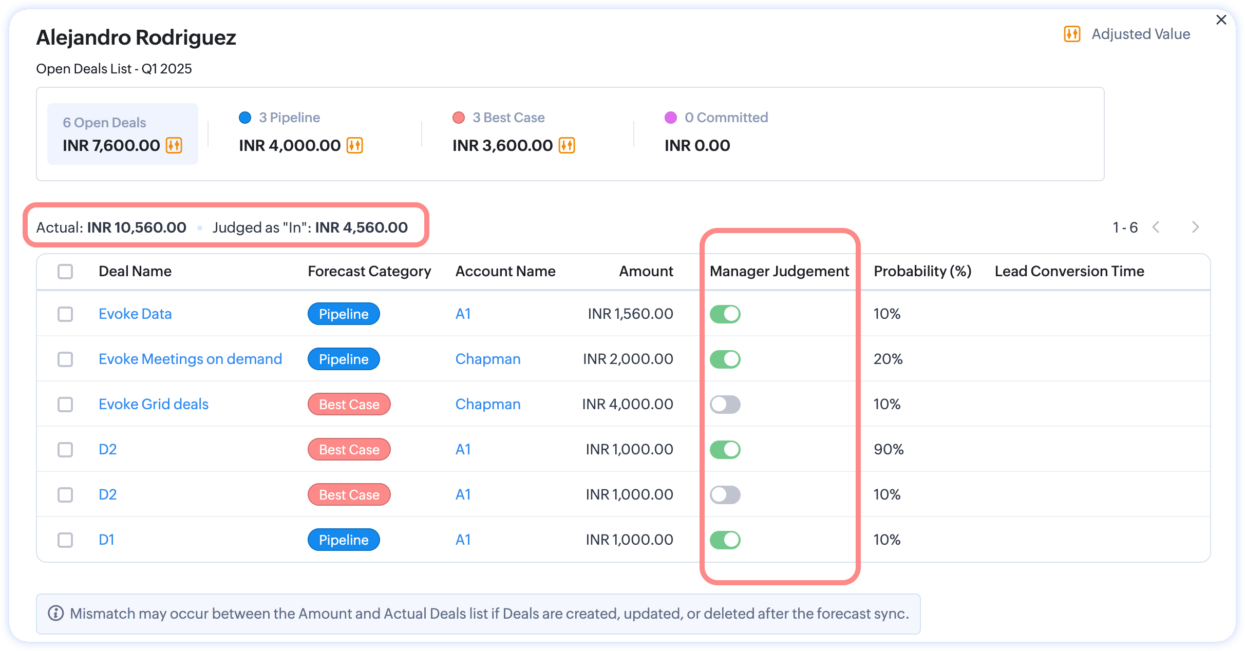 Your open deals are a reflection of ongoing performance, and based on their momentum, they are categorized as pipeline, best case, and committed in your forecast report. However, irrespective of these categories, the best people to know and reflect your likely-to-be revenue are your sales rep and their managers.