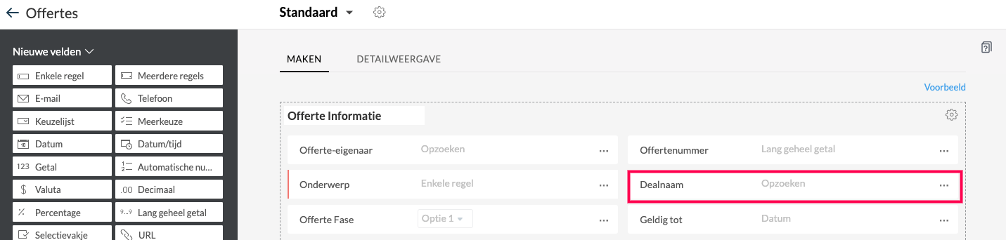 Voor bestaande gebruikers: Het opzoekveld voor de dealnaam is beschikbaar in de sectie met ongebruikte velden. Je kunt het eenvoudig naar de lay-out slepen en het indien nodig gebruiken voor de facturen.