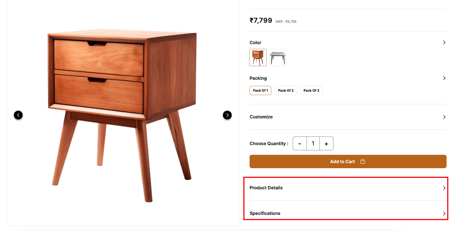 Right now, under each product, I can see expandable sections like Product Details and Specifications. I’d like to add two additional toggle sections, labeled: