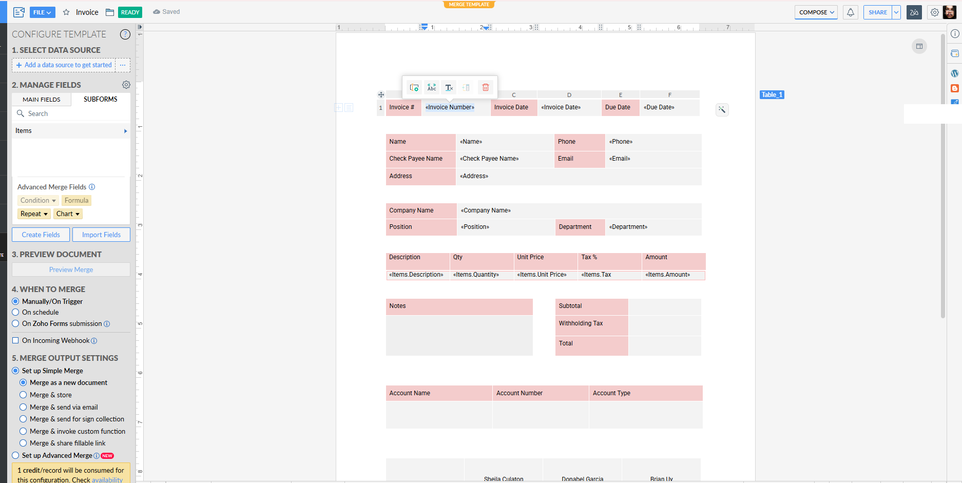 I have the following layout for a Zoho Writer Document. As you can see there is a repeating subform taking in "Items".