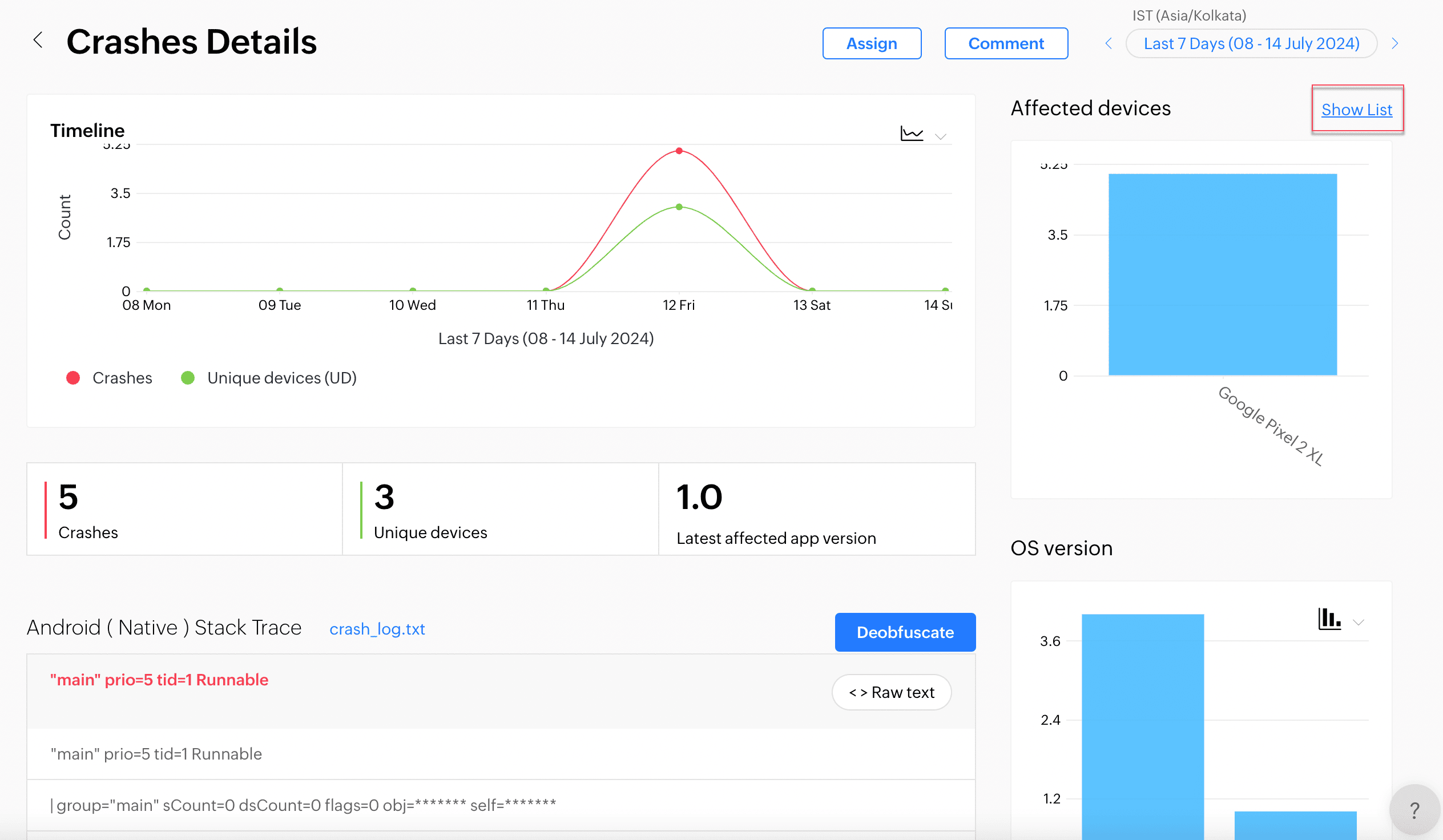 You no longer need to click on an individual issue and scroll to the bottom of the crash details page to see the list of crash instances that happened across different devices. Instead, you can now simply click on Show List, and it will show you the list of all the crash instances.