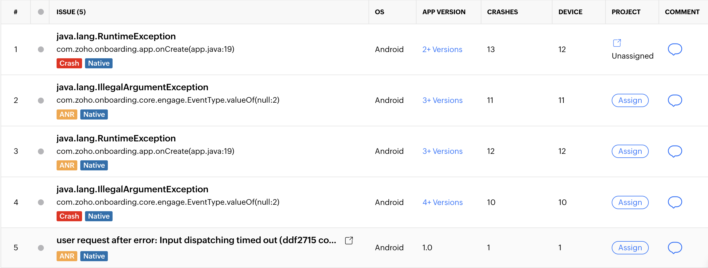 For more clarity, you will see tags beside each issue listed in the console. One tag will notify whether it is an ANR or a crash. The other tag will specify the app framework for which the crash or ANR is reported.