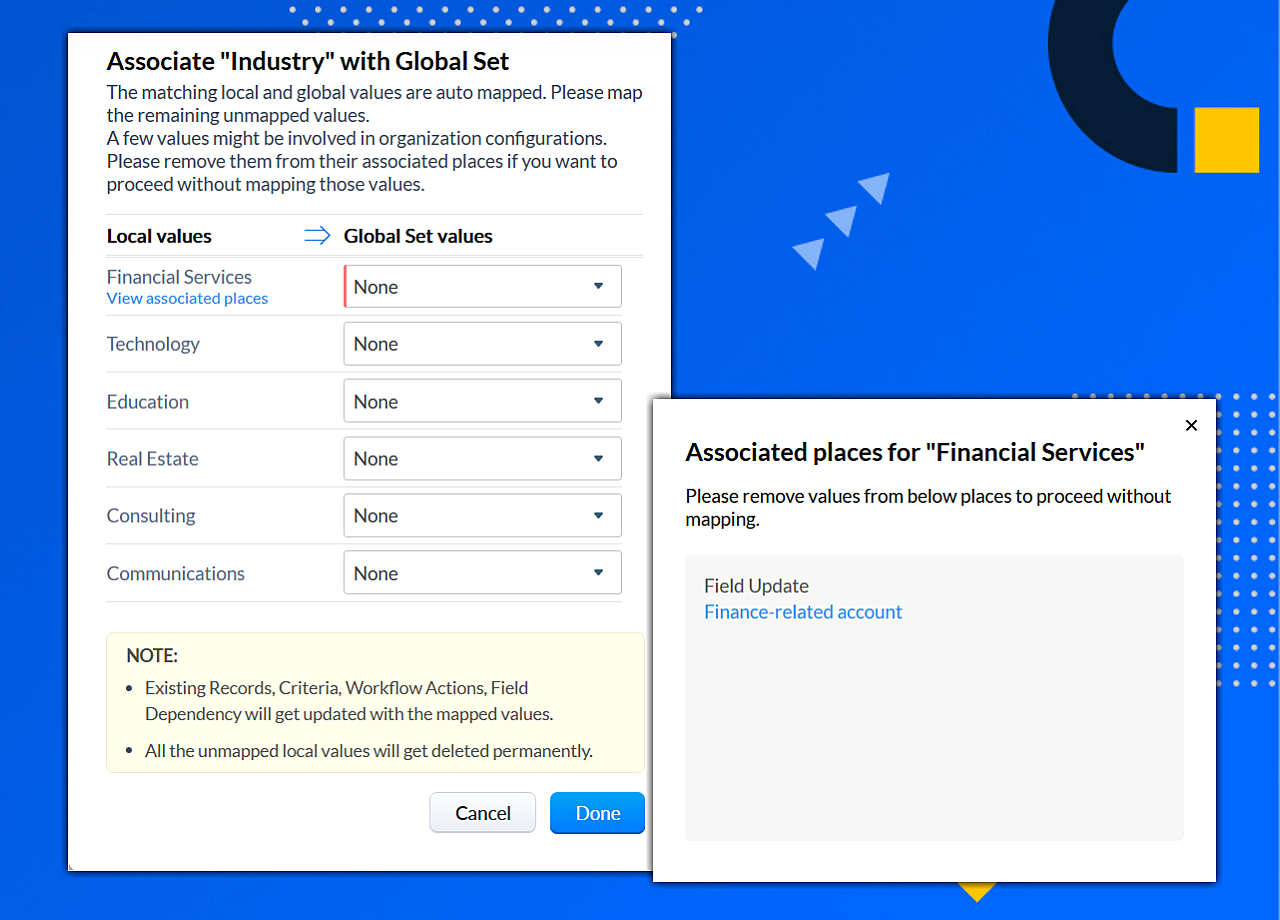 *If the same value is present in the global set, the value is mapped automatically. It's mandatory to map a value if it's used in places like workflow rules, field updates, etc.