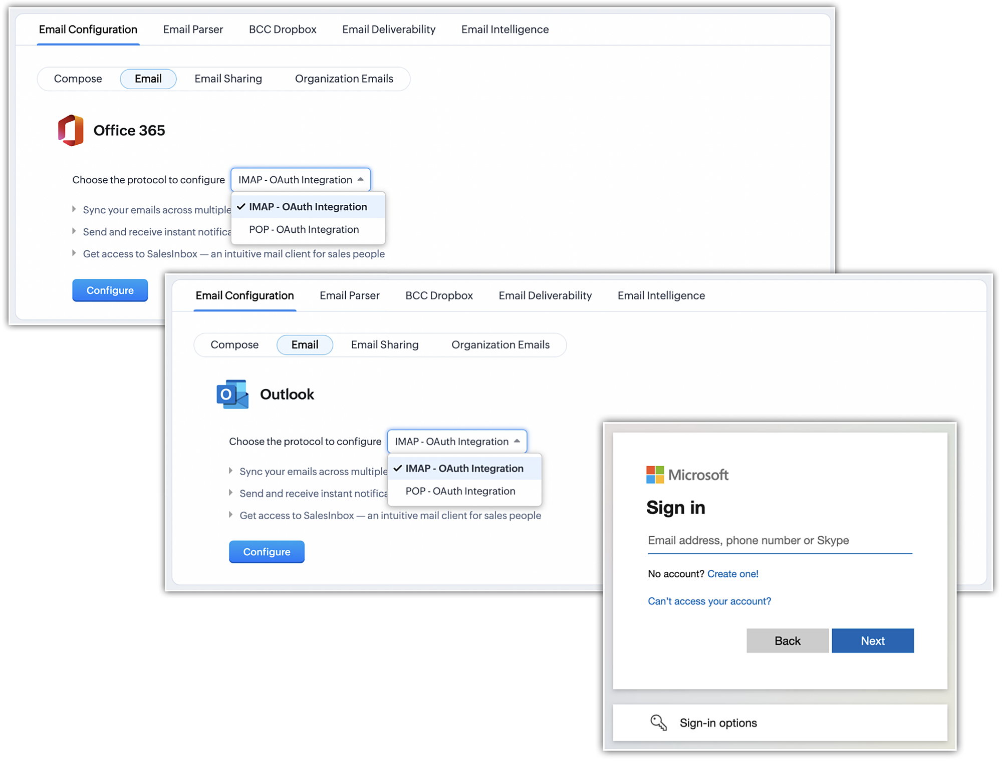 Microsoft no longer supports their basic authentication method. With our latest enhancement, we've introduced modern authentication support so that you can now securely and easily integrate your Office365 and Outlook accounts with Zoho CRM without requiring repeated sign-ins.
