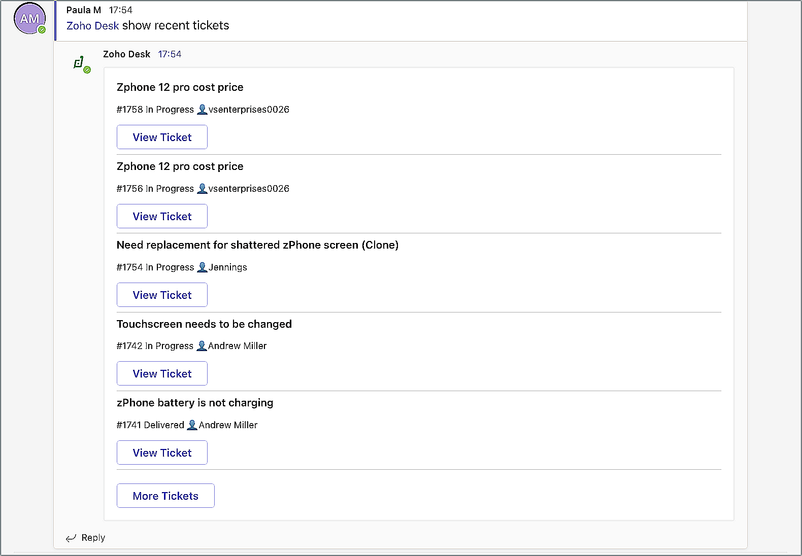 - Channel Bot - With the help of channel bot, users can track what other users have been talking about. For instance, users can get to know about the resolution of a critical support ticket. They can customize the notifications, enable message extensions, find specific or recent tickets, create new tickets, and more!