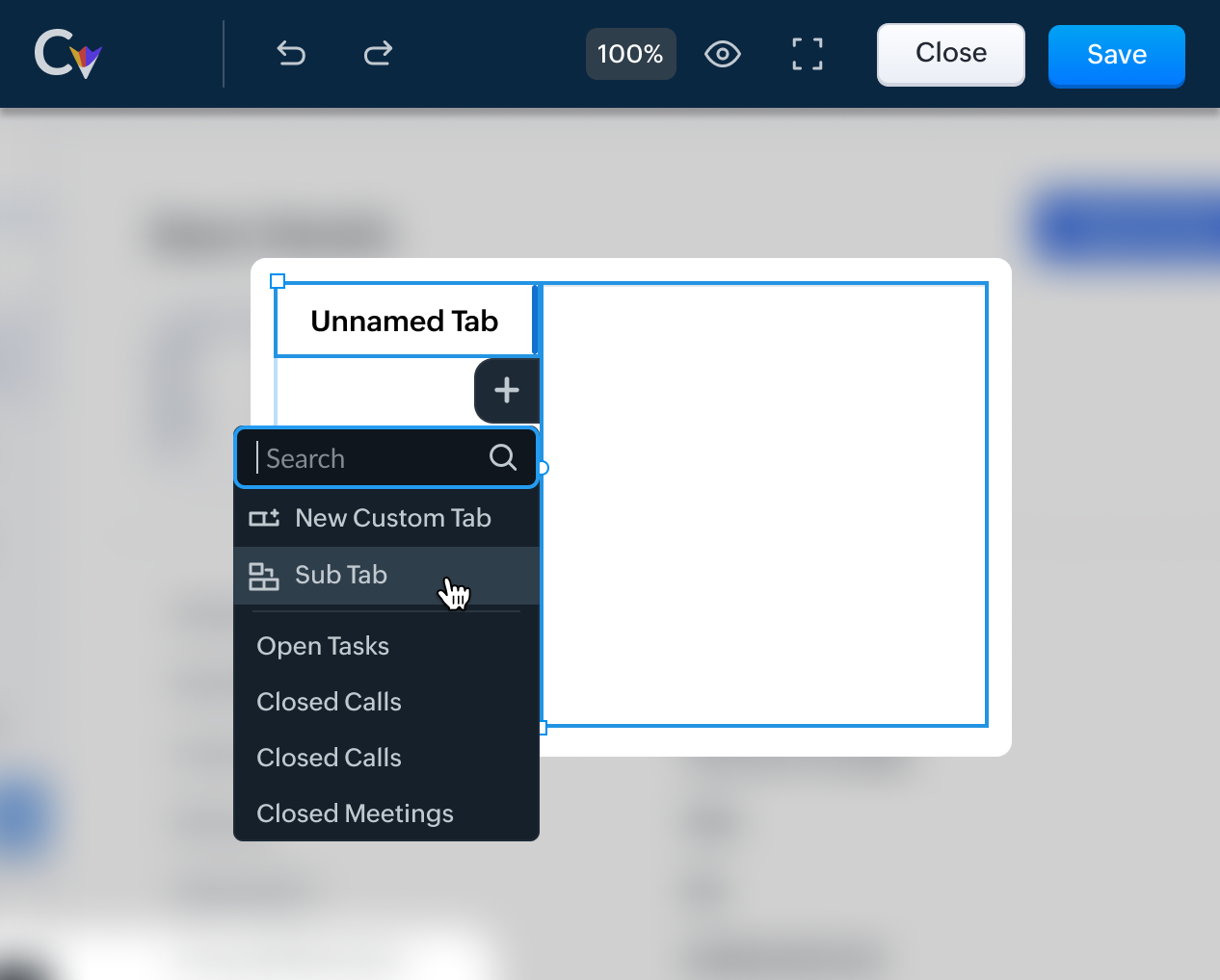 When you add a Tab from your elements onto your Canvas view editor, you have the option of adding Custom Tabs, Sub Tabs or Related Lists.