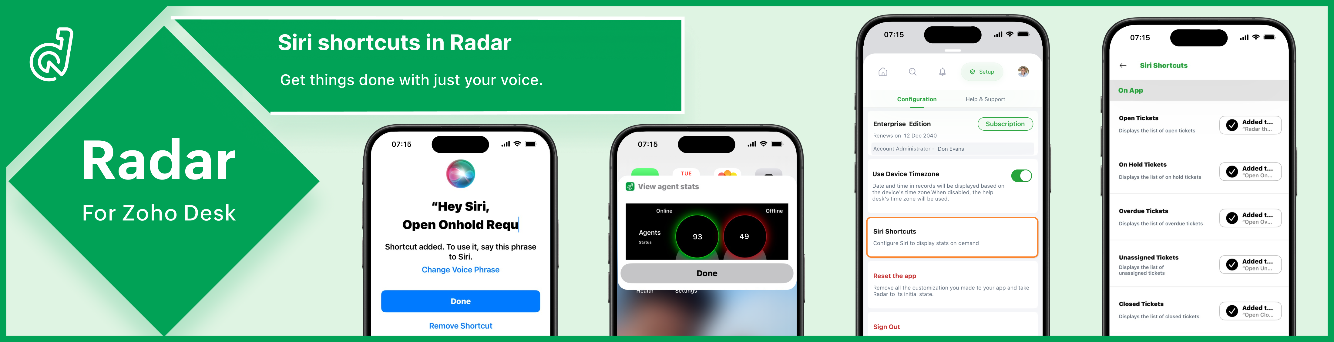 Radar gives you the option to use a custom phrase to invoke Siri. For example, you can colloquialize the phrase to display online agents as "Hey Siri, who's online?" for convenience.