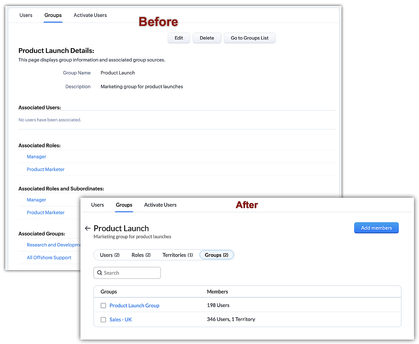 - The page for creating a new group has been revamped and now uses pop-up screens to update details such as group name and description, and to add members to groups as individual users, roles, subordinates, territories, or other existing groups.