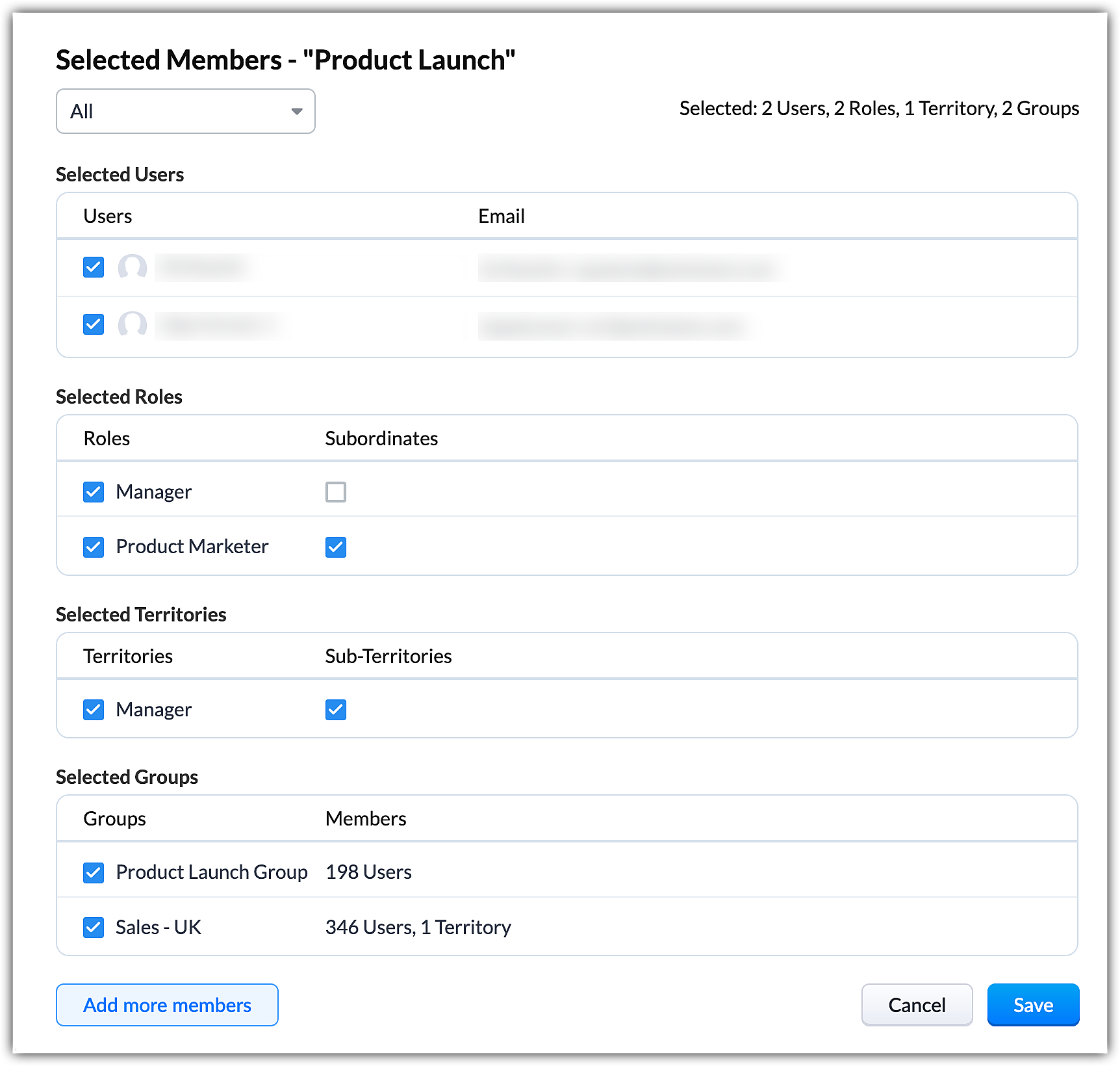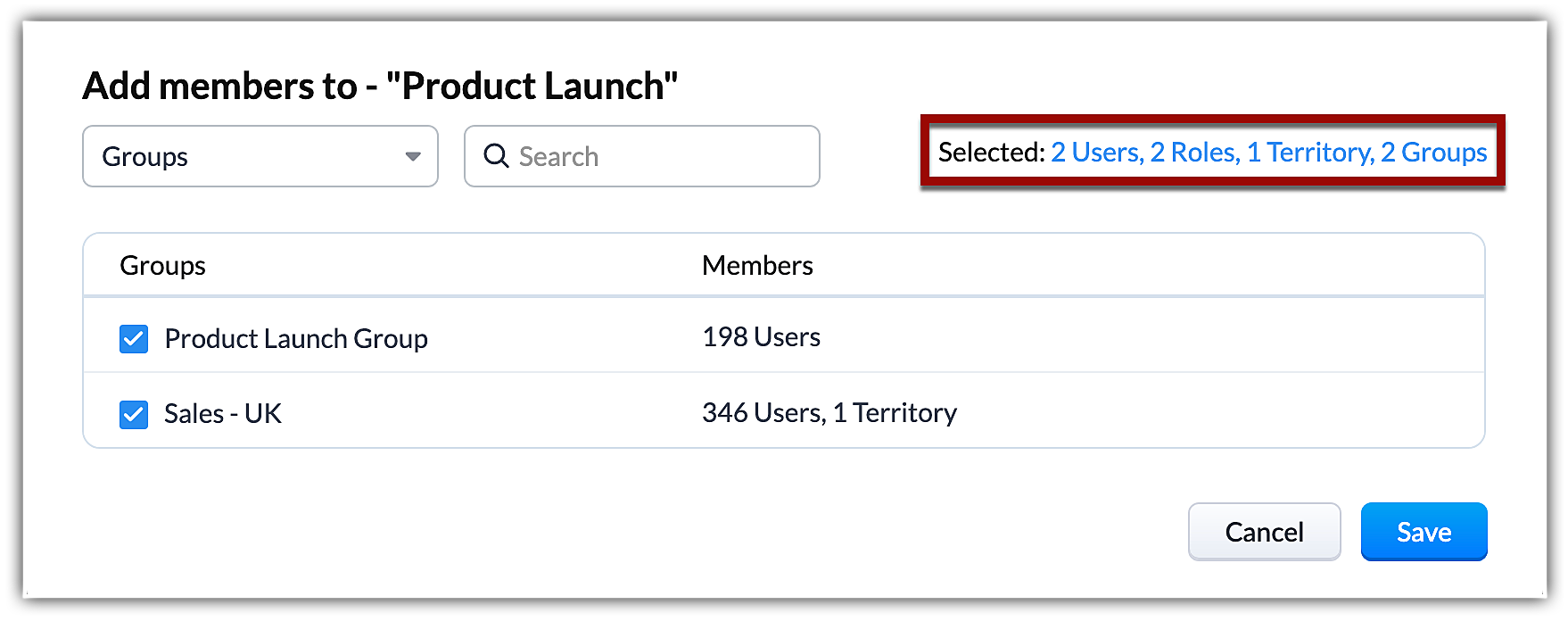 - The selections you make while creating a group are now neatly categorized into Selected Users, Selected Roles, Selected Territories, and Selected Groups.