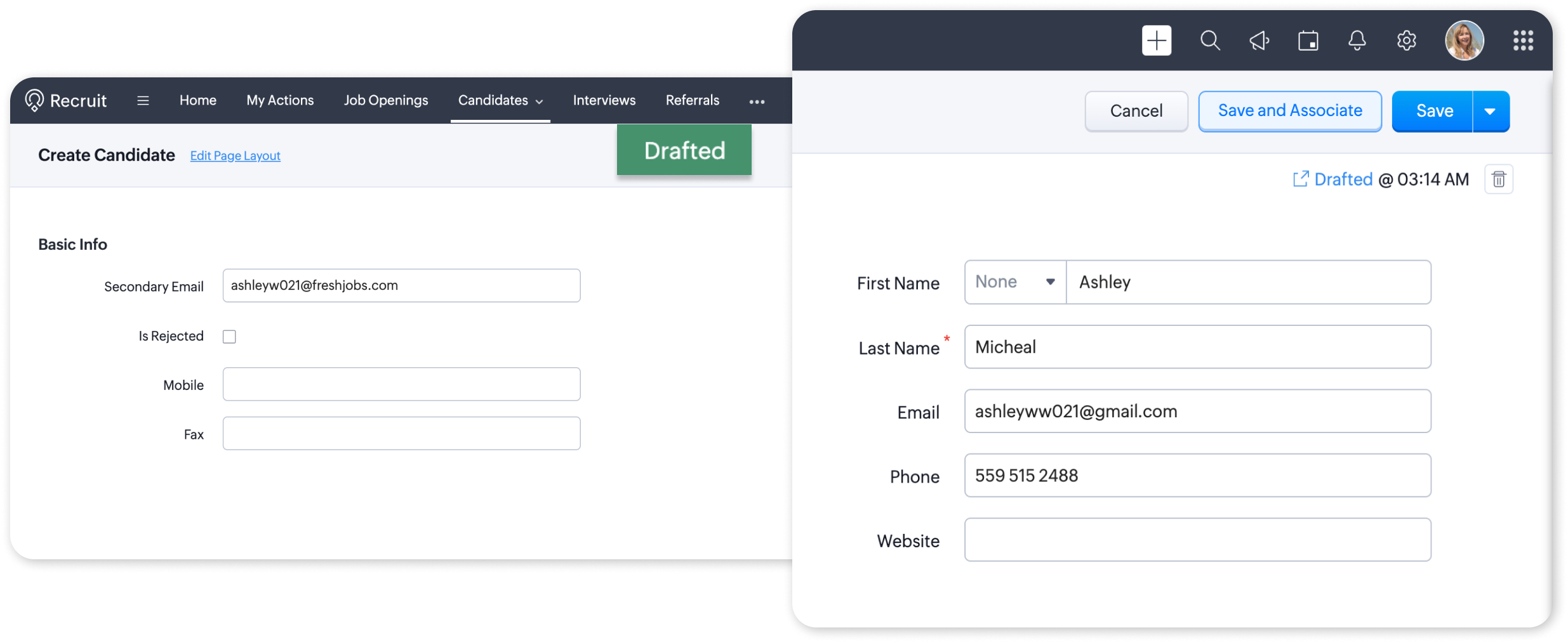 It uses an auto-save function, wherein Zoho Recruit will automatically back up your draft every minute. So you can start working on a record, save it as a draft, then come back and resume work later without worrying about losing your progress.