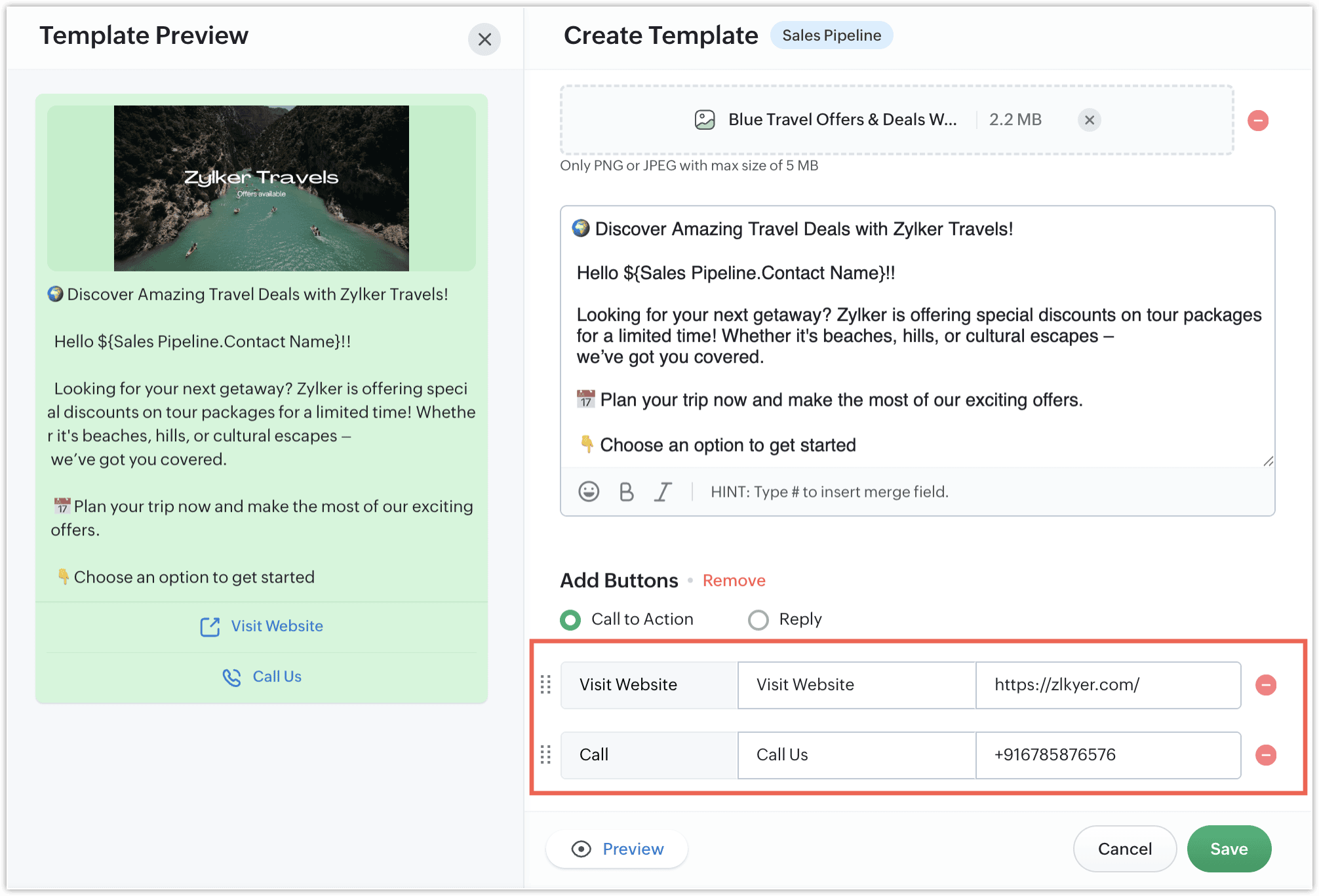 Previously, users could only use templates in the Contacts module. With this update, you can now create and use templates for the Pipelines module as well, so you can send WhatsApp messages directly from deals and other pipeline records, making your communication more contextual and relevant.