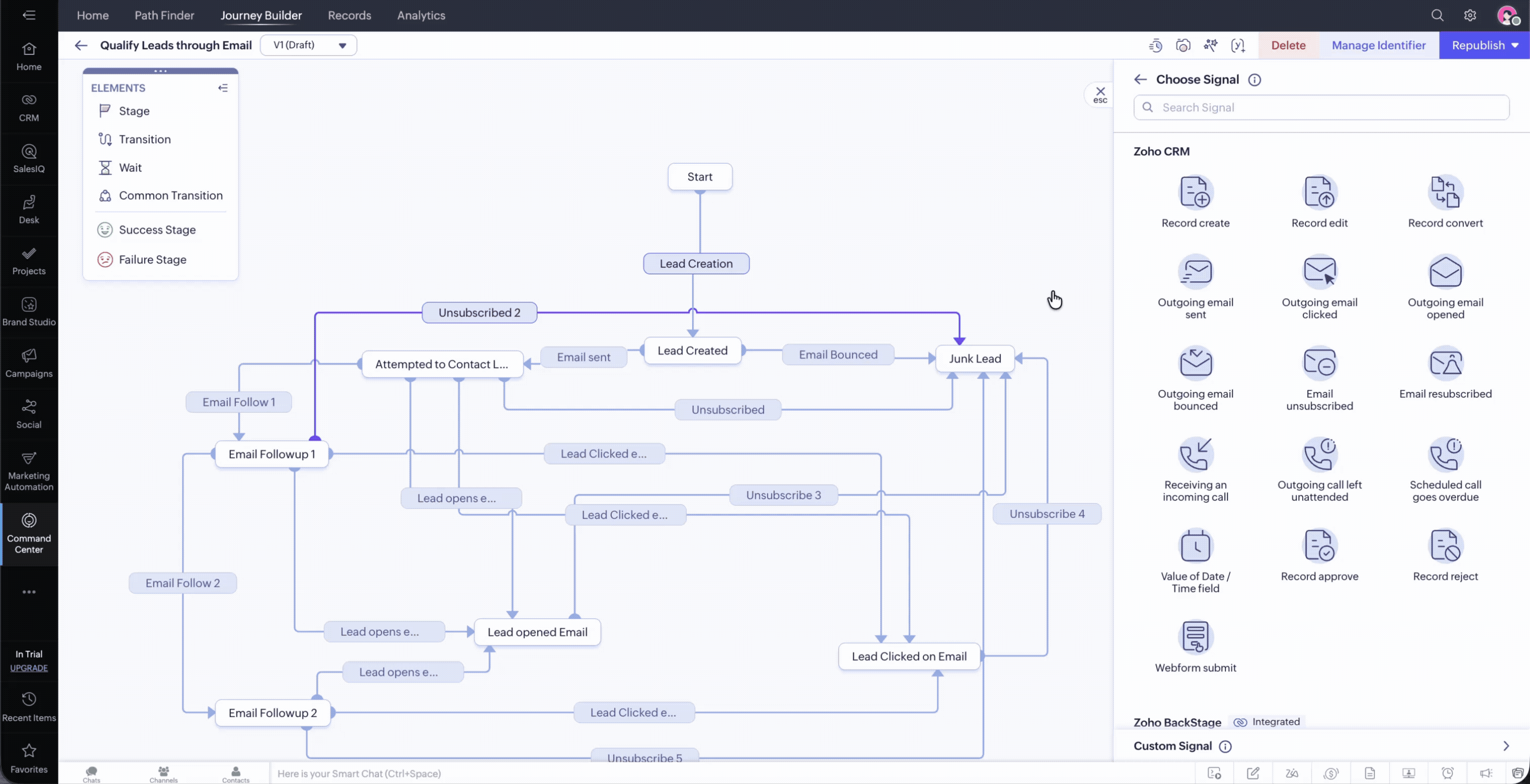 We've strengthened CommandCenter's capabilities further in Zoho CRM Plus by combining signals (triggers) from various modules—like CRM, Desk, SalesIQ, Backstage, Webinar, and Survey—with a revamped user interface. You can also create custom signals to simplify the process of connecting with touchpoints from your own or third-party apps.